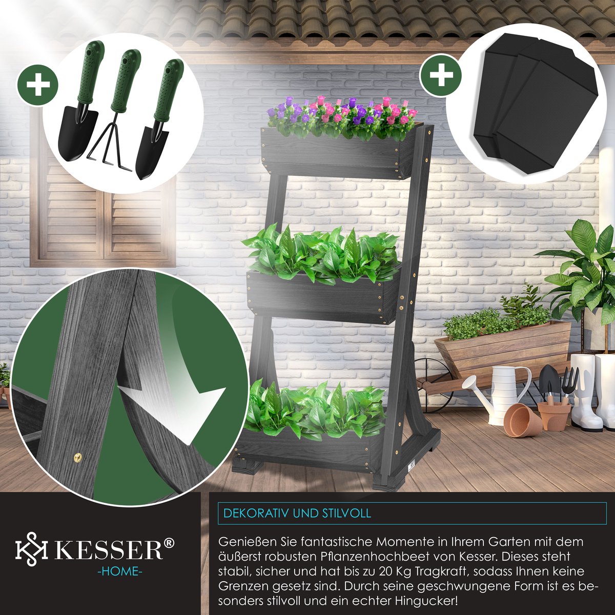 Voor mensen met rug- of kniepijn kan zelfs de eenvoudigste tuinverzorging een groot probleem worden. Knielen, bukken of hurken behoren tot het verleden met ons verhoogde bloembed van KESSER. Dankzij de ergonomische werkhoogte kunt u pijnvrij voor uw planten zorgen. Of neem plaats op een stoel voor ons bloembed - Tuinieren kan niet comfortabeler zijn! Ongeacht de ondergrond staat ons bloembed stevig en stabiel, bijna op elke bodem.