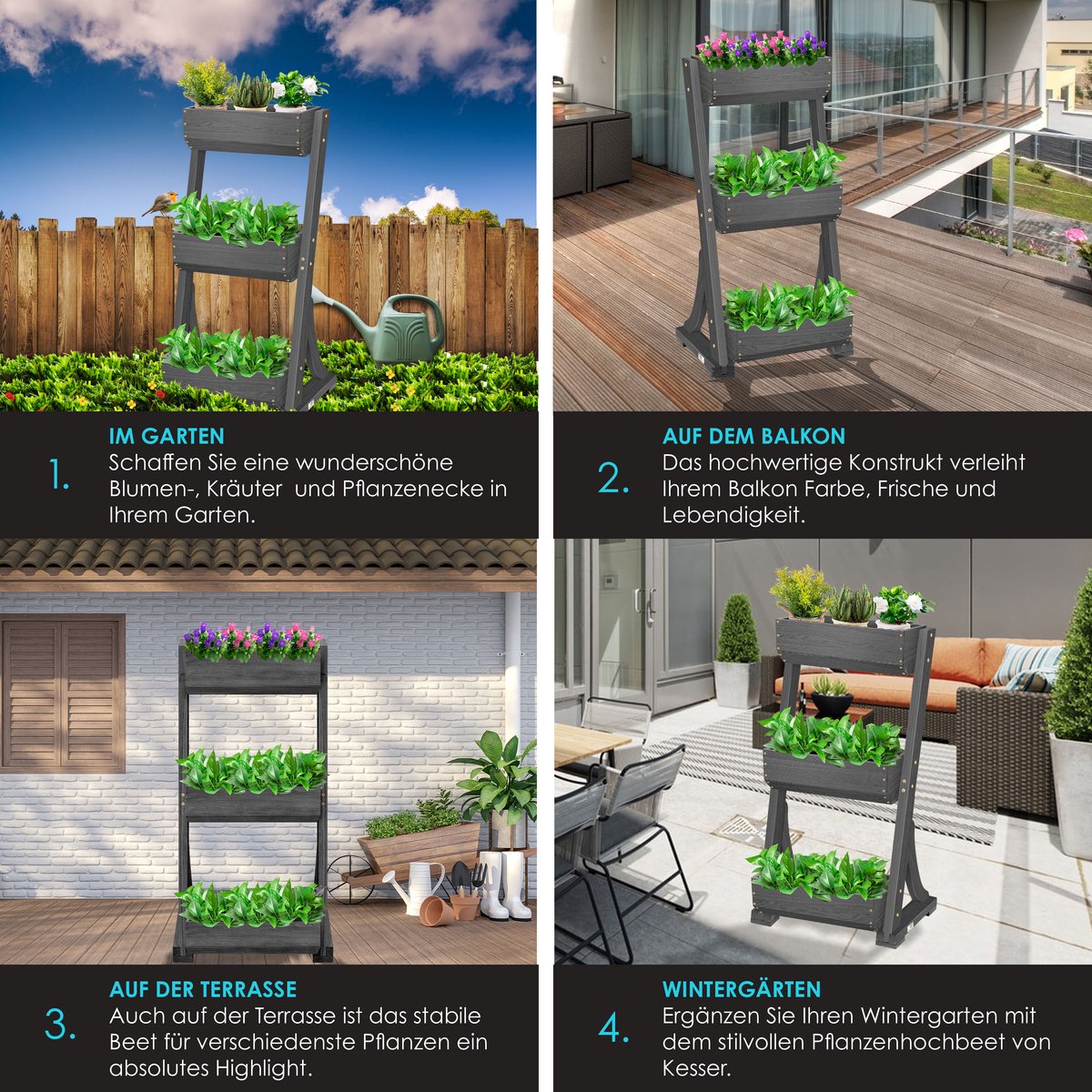 Wilt u graag wat frisse wind in uw tuin brengen en bent u de saaie bodembedden zat? Met ons moderne trapsgewijze bloembed van KESSER onderscheidt u zich meteen van gewone tuinen. Bovendien kunt u met ons bloembed op uw balkon in een handomdraai een groene oase creëren. Naast het visuele hoogtepunt overtuigt onze bloembak ook met zijn technische voordelen ten opzichte van gewone bloembedden.