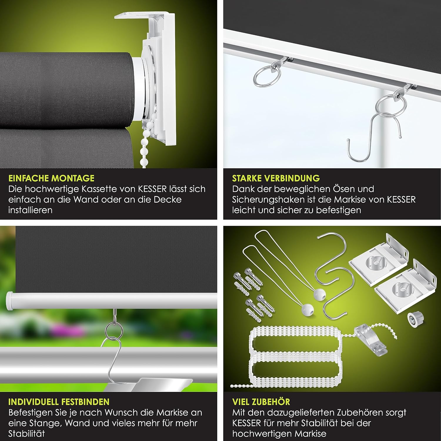 De meegeleverde montageset dient voor een eenvoudige en flexibele installatie van de luifel. Aan het einde van het rolgordijn bevinden zich twee bollen, die je zowel aan de muur, het raam als over de deur kunt schroeven. Voor meer stabiliteit worden vervolgens S-vormige ringen op de bodem bevestigd.