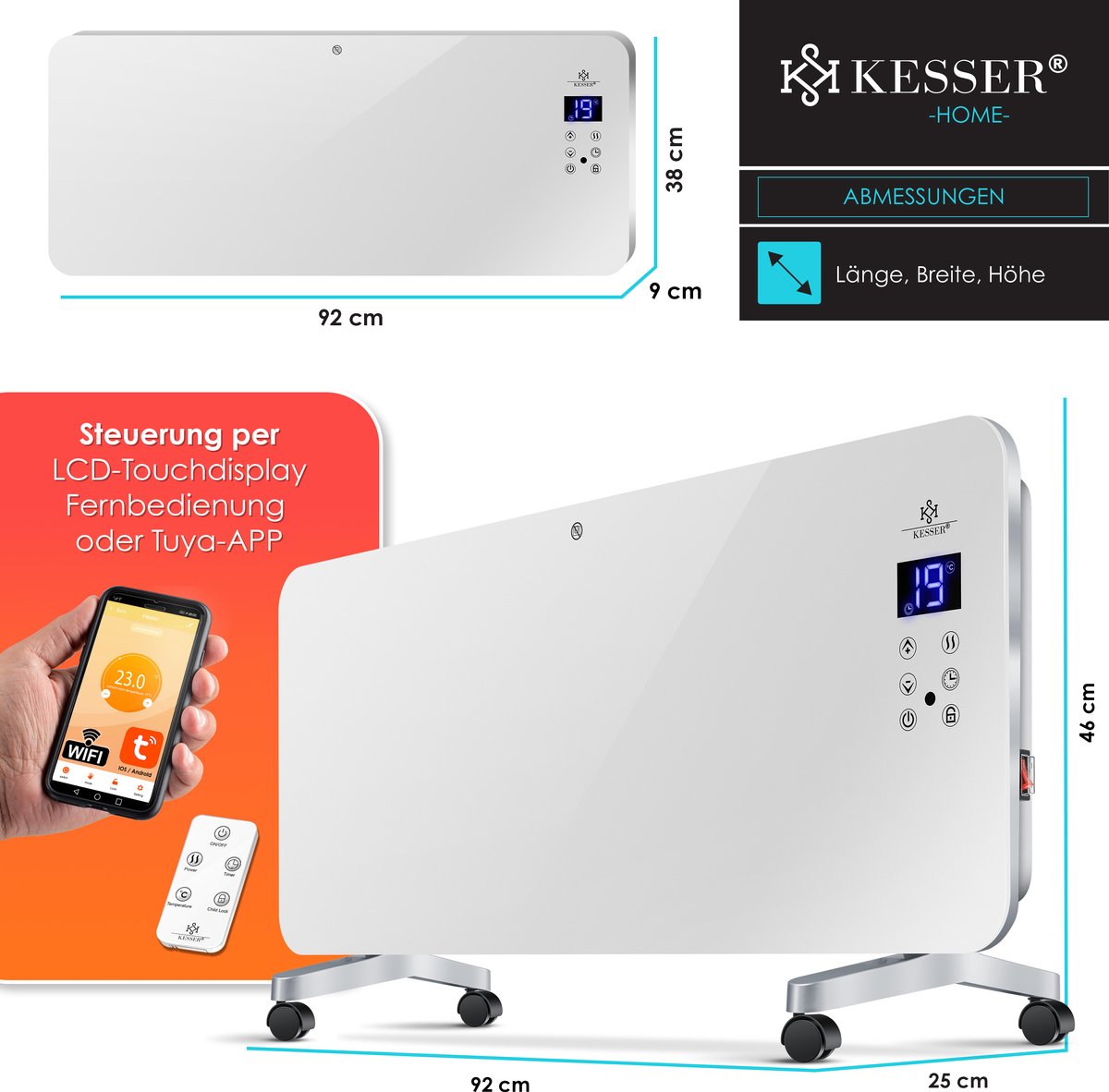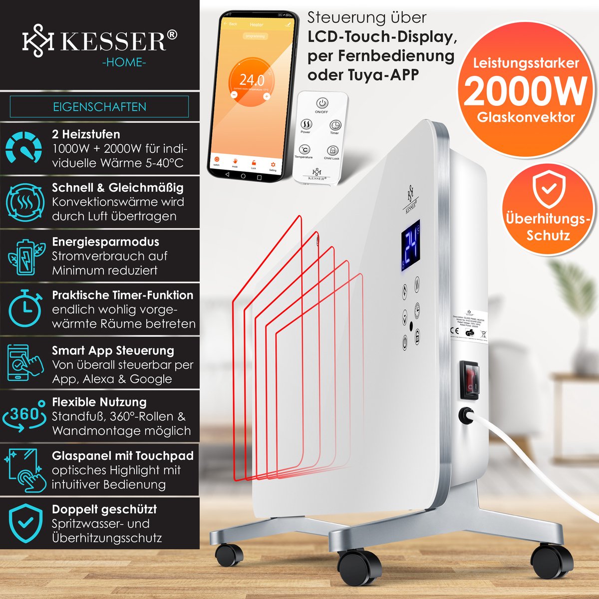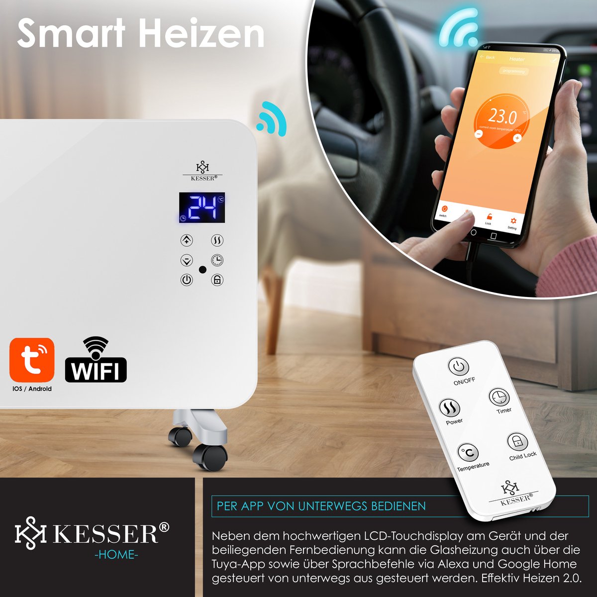 KESSER glazen convector, incl. Tuya Smart app bediening en afstandsbediening, twee vermogensstanden, timerfunctie, touchpad, wandmontage mogelijk, incl. warmteregeling.