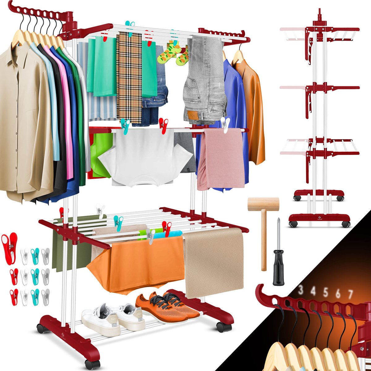 KESSER Waskledingrek inklapbare zijvleugels, ruimte voor 14 kledinghangers, ruimtebesparing, draagvermogen 50 kilogram, solide dubbele kolommen, 360°-wielen met rem, flexibele niveaus, 12 gekleurde wasknijpers, ruime planken, inklapbare kledinghangerhouders