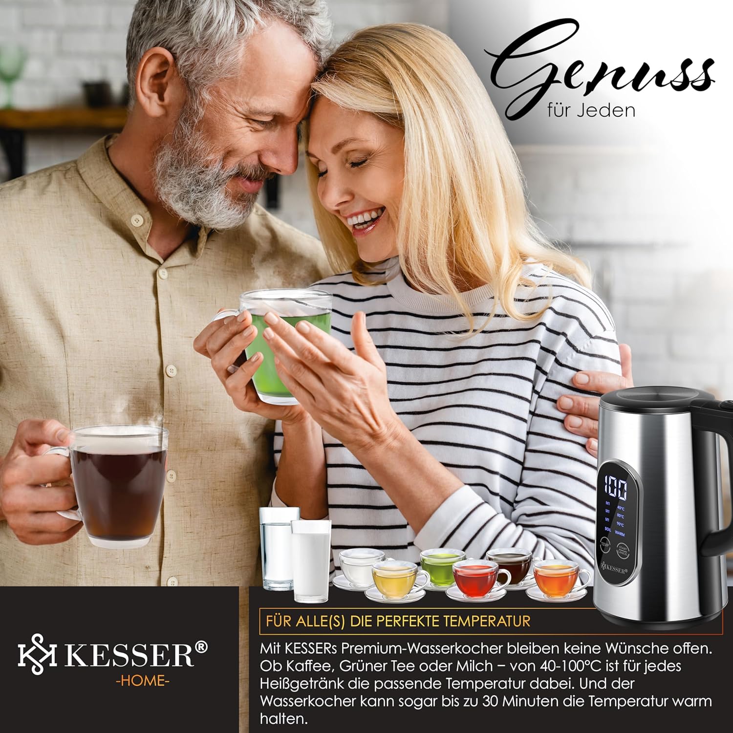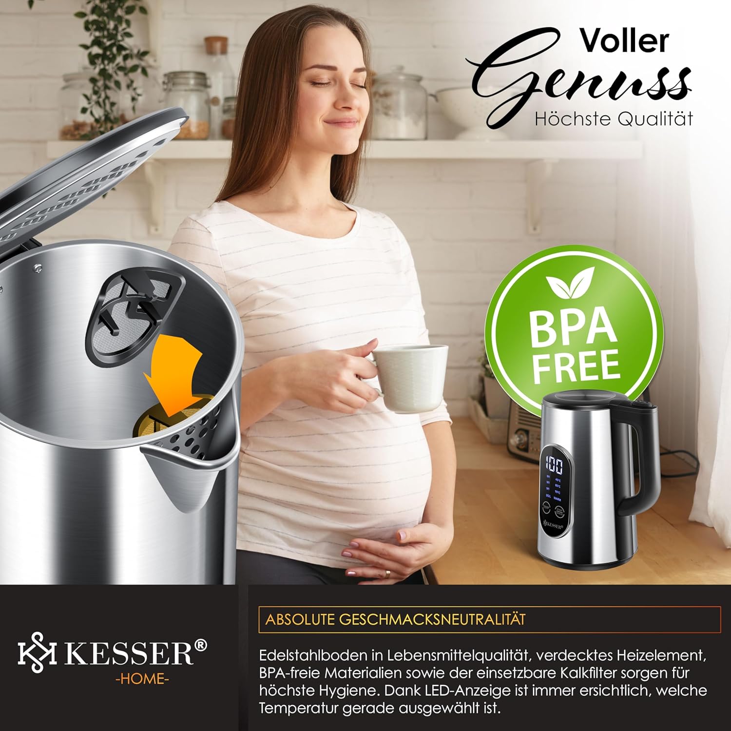 • Praktische temperatuurregeling en langdurige warmte: de KESSER waterkoker biedt de mogelijkheid om te kiezen tussen 40 °C, 80 °C, 90 °C en 100 °C. Met een krachtige 2200 watt verwarming bereikt het water snel de gewenste temperatuur, die dankzij de warmhoudfunctie tot 30 minuten constant blijft. Of het nu voor melk, thee of koffie is, geniet altijd van de perfecte temperatuur voor je favoriete drank.