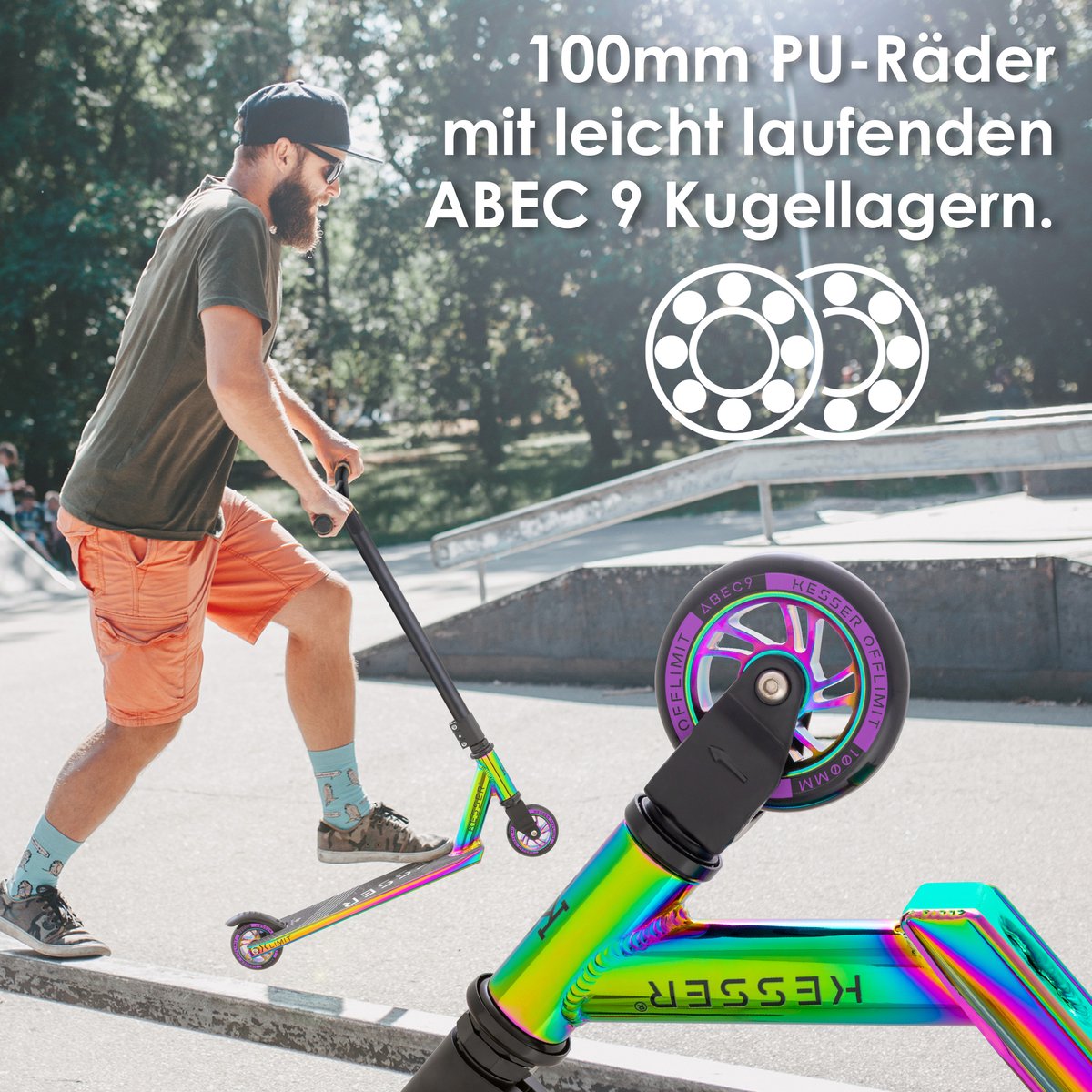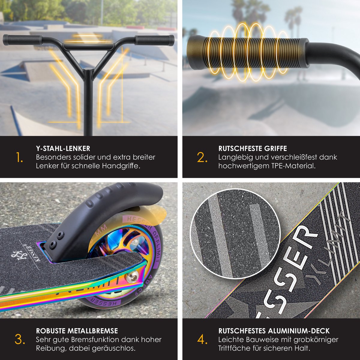 OVERTUIGENDE VEILIGHEID: Safety First! Onze KESSER Stunt Scooter is uitgerust met een achterwielrem en een antislip voetoppervlak, evenals versterkte handgrepen. De schroeven zijn volledig afgedicht met aluminium en kunnen dus veel aan. Dankzij een royaal voetoppervlak en een draagvermogen van maximaal 100 kg sta je altijd veilig - we hebben aan alles gedacht, zodat je zorgeloos en veilig kunt cruisen.