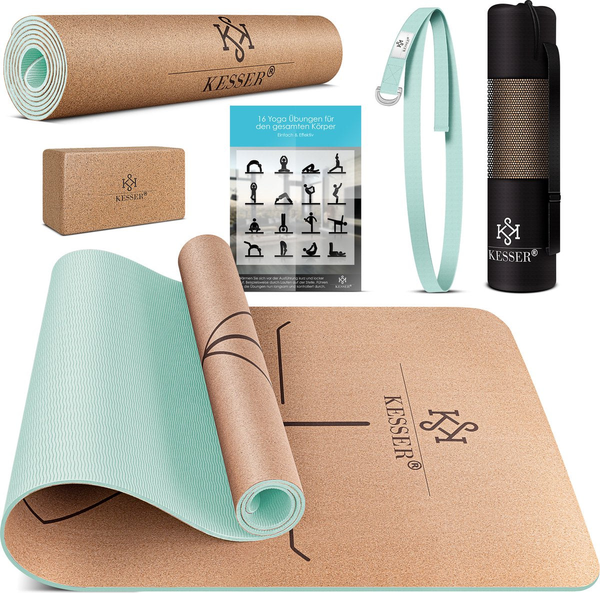 KESSER® Yogamat Kork Inclusief Draagriem Tas & Yoga Blok Gymnastiekmat Yoga Mat Antislip van Natuurrubber TPE Fitnessmat, 183 x 62 Oefenmat voor Fitness Sportmat, Extra Dikke Gymnastiekmat