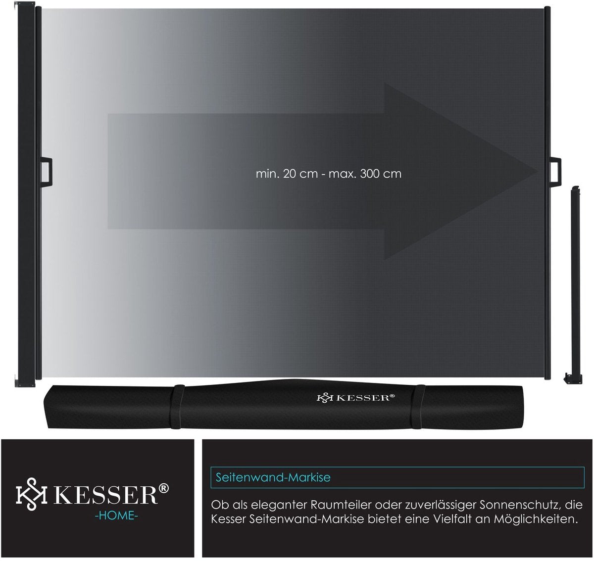De balkonzonwering van KESSER is snel en veelzijdig te gebruiken dankzij de eenvoudige en flexibele installatie . Omdat het zijscherm in de kast is opgerold, kunt u het doek eenvoudig uittrekken tot de gewenste lengte . U kunt de zijzonwering naar wens verstellen om uw terras of tuin te beschermen tegen zon en wind . Voor buitengebruik profiteert de zonwering van zijn waterafstotende functie - en dankzij het robuuste oppervlak is het materiaal eenvoudig en gemakkelijk te reinigen met een vochtige doek . Dankzij de verschillende kleurmogelijkheden is de loftzonwering ook een visuele blikvanger . De verschillende maten maken het bovendien mogelijk om de perfecte zonwering voor u te vinden.