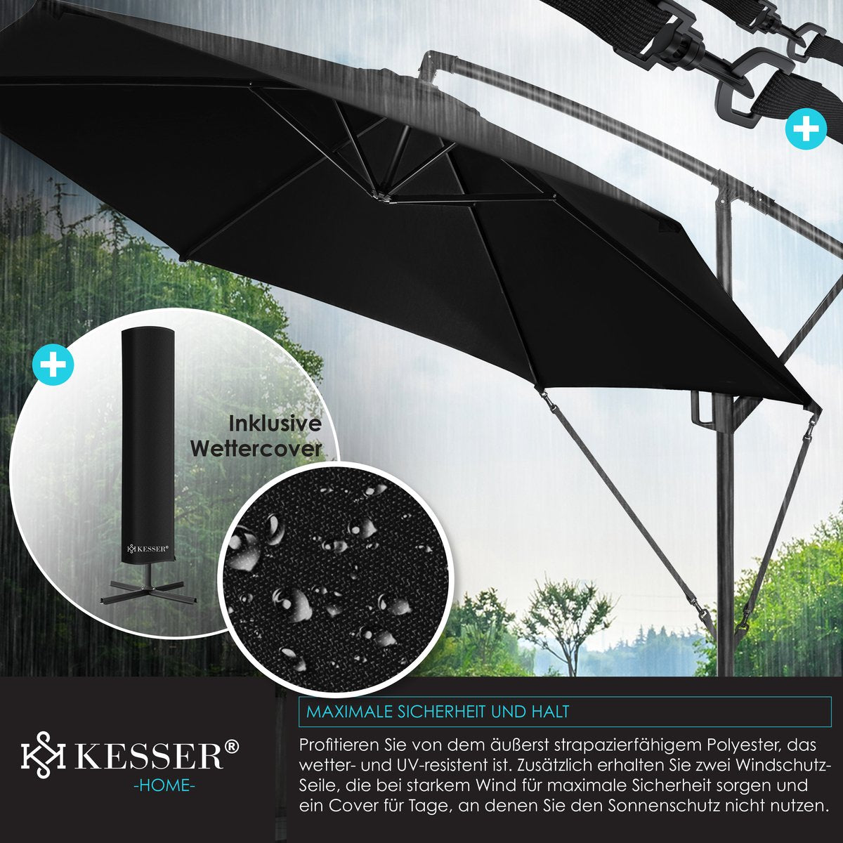 ROBUUST & VEILIG: Een robuuste mast van lichtgewicht en roestvrij aluminium met een diameter van 48 mm zorgt voor stabiele ondersteuning, en 6 baleinen zorgen voor extra stabiliteit. Bovendien kan de parasol op het voetkruis worden verzwaard met de bijpassende KESSER parasolvoet om bestand te zijn tegen wind en weer. Het schermdoek is gemaakt van 100% polyester en is waterafstotend, zodat u de parasol ook bij regen kunt gebruiken.