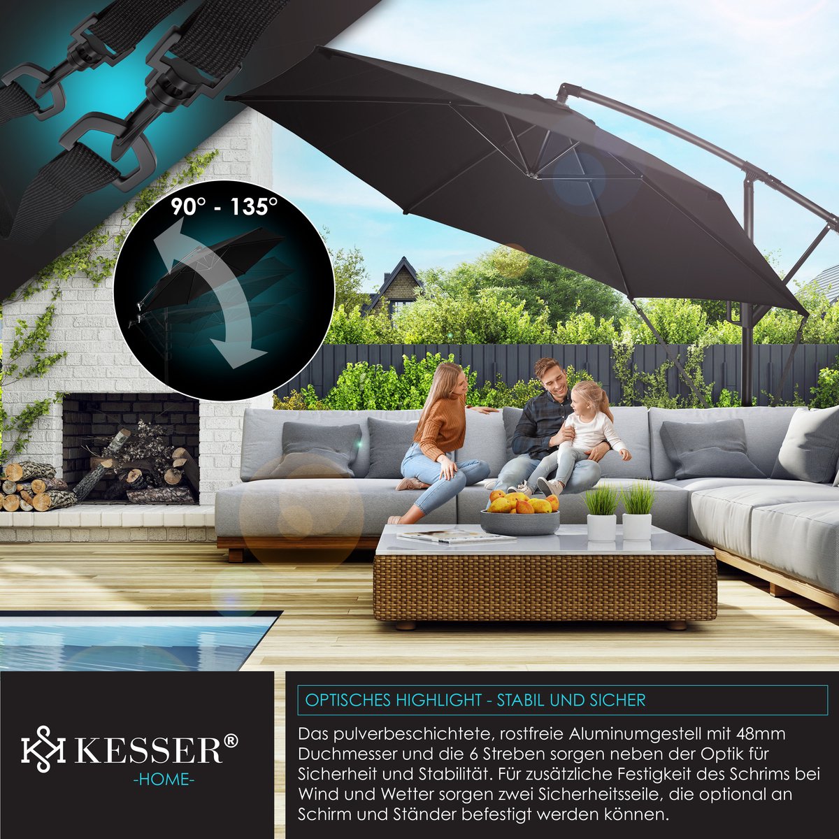Een robuuste mast van lichtgewicht en roestvrij aluminium met een diameter van 48 mm zorgt voor stabiele ondersteuning, en 6 baleinen zorgen voor extra stabiliteit. Bovendien kan de parasol op het voetkruis worden verzwaard met de bijpassende KESSER parasolvoet om bestand te zijn tegen wind en weer
