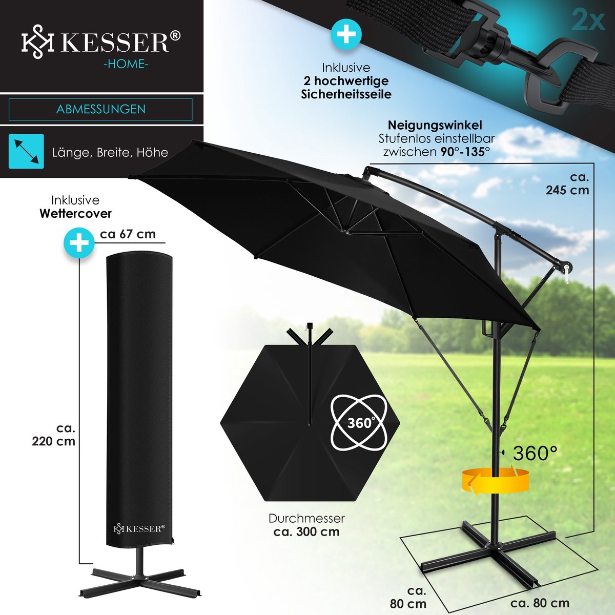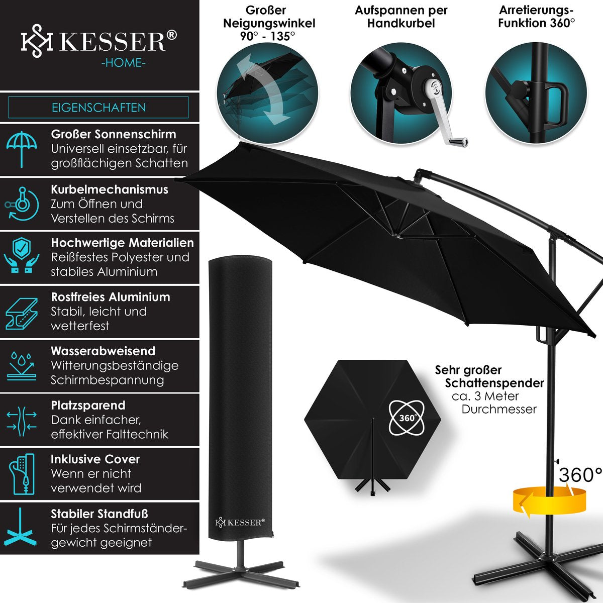 KESSER® Zweefparasol met voet - Ø3m - 360° Draaibaar - Zwart