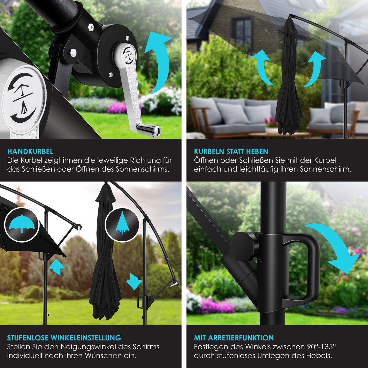 Met het geïntegreerde zwengelsysteem kunt u de parasol eenvoudig openen en sluiten met de soepel lopende slinger. Zo heeft u uw parasol in enkele seconden gespannen en kunt u van de zomer genieten - draaien in plaats van tillen.