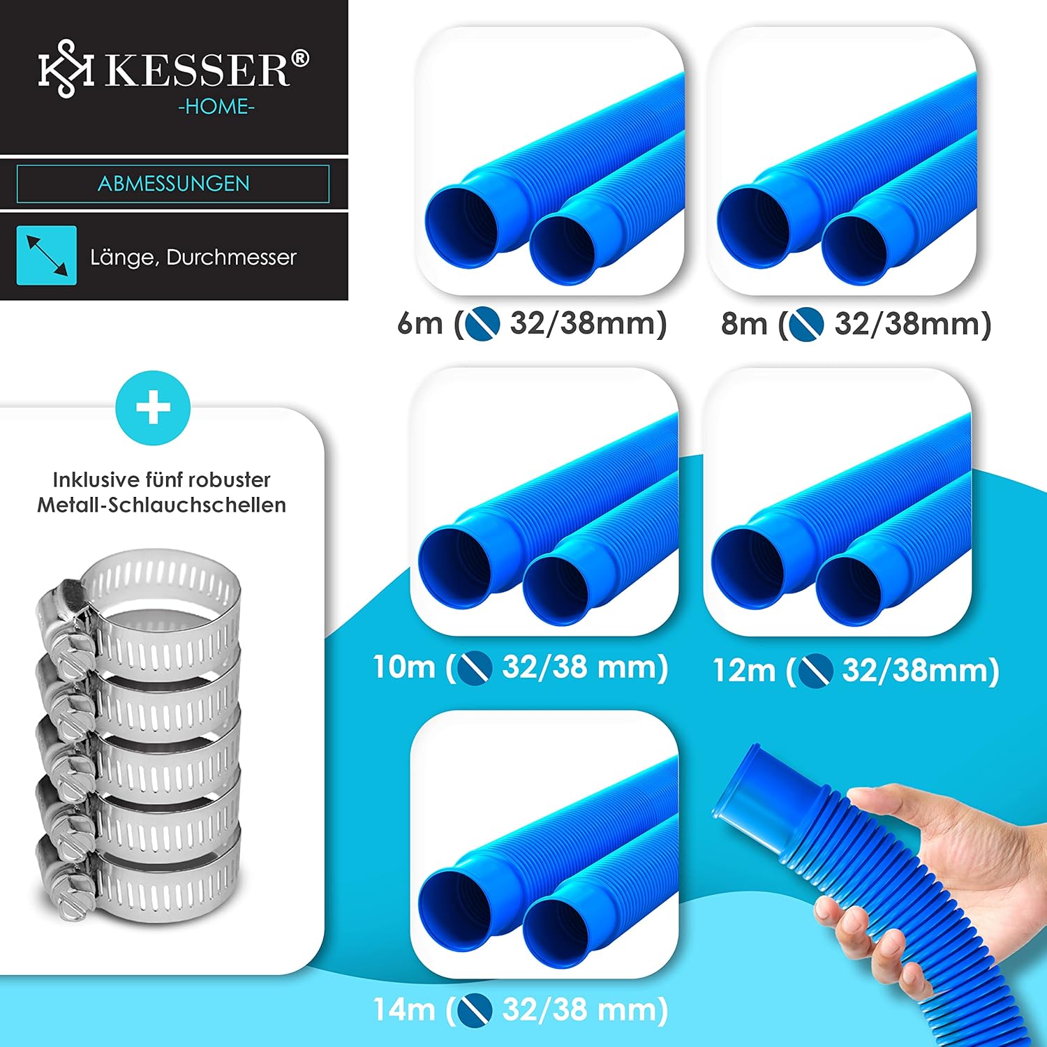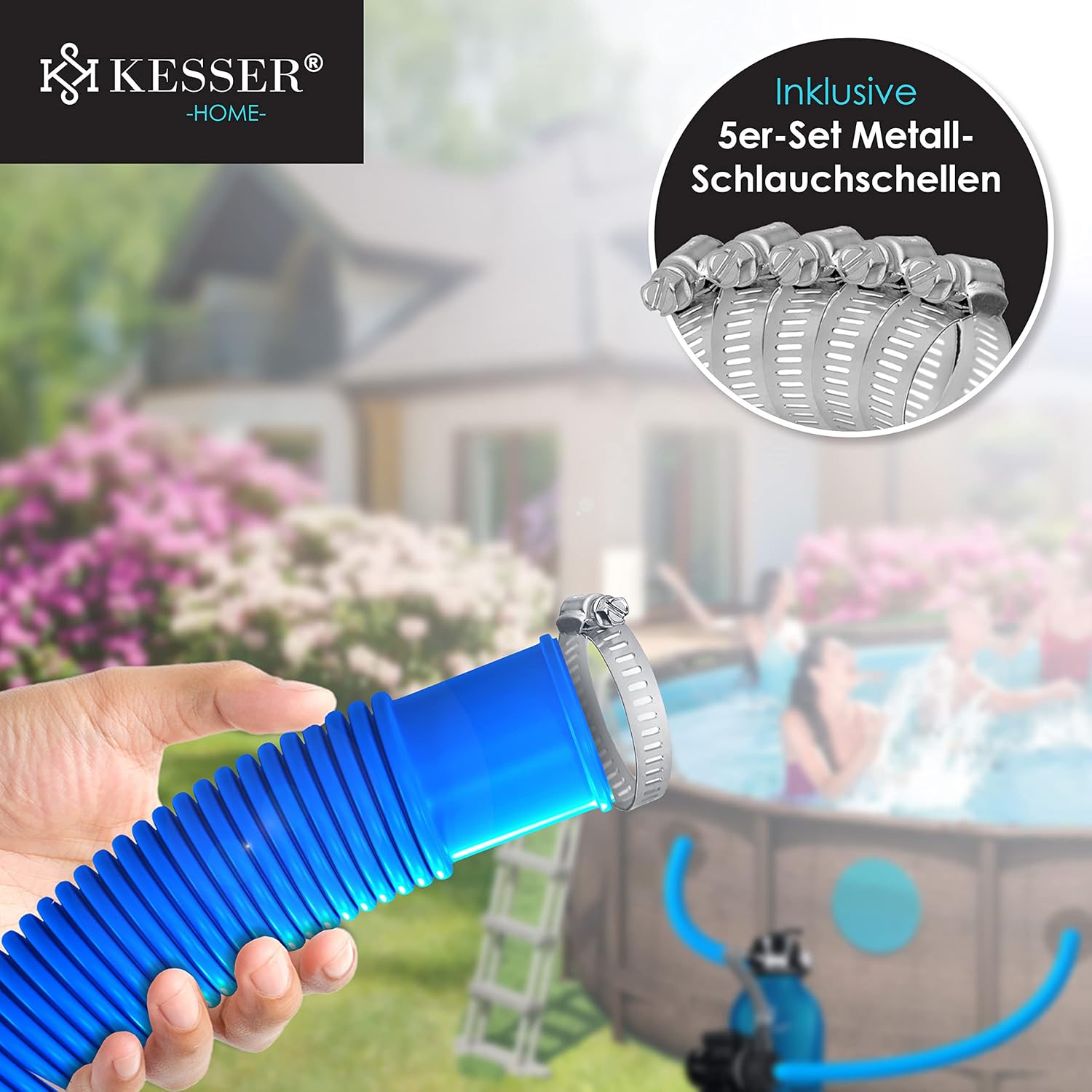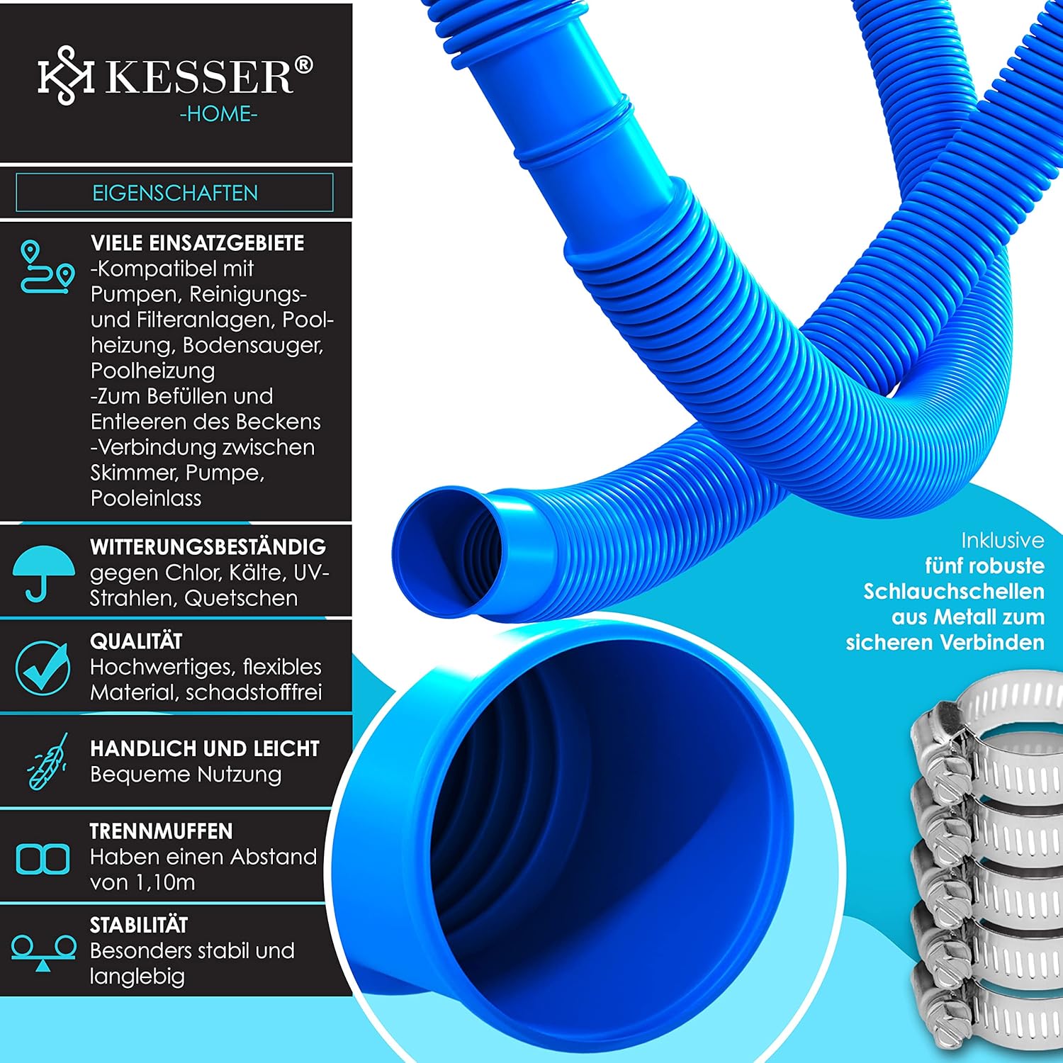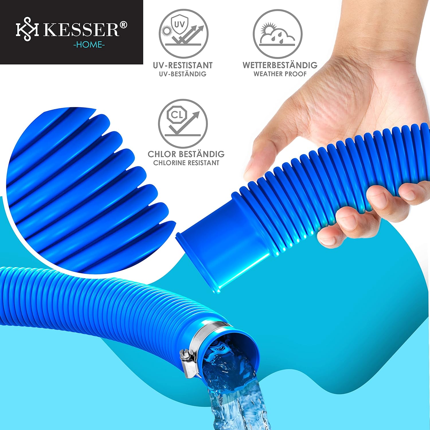 Kesser zwembadslang van hoogwaardig, bijzonder duurzaam en vrij van schadelijke stoffen en flexibel materiaal, bestand tegen chloor, kou, uv-stralen en knijpen, afstand van de moffen bedraagt 1,10 m en is daarom geschikt voor vele toepassingen