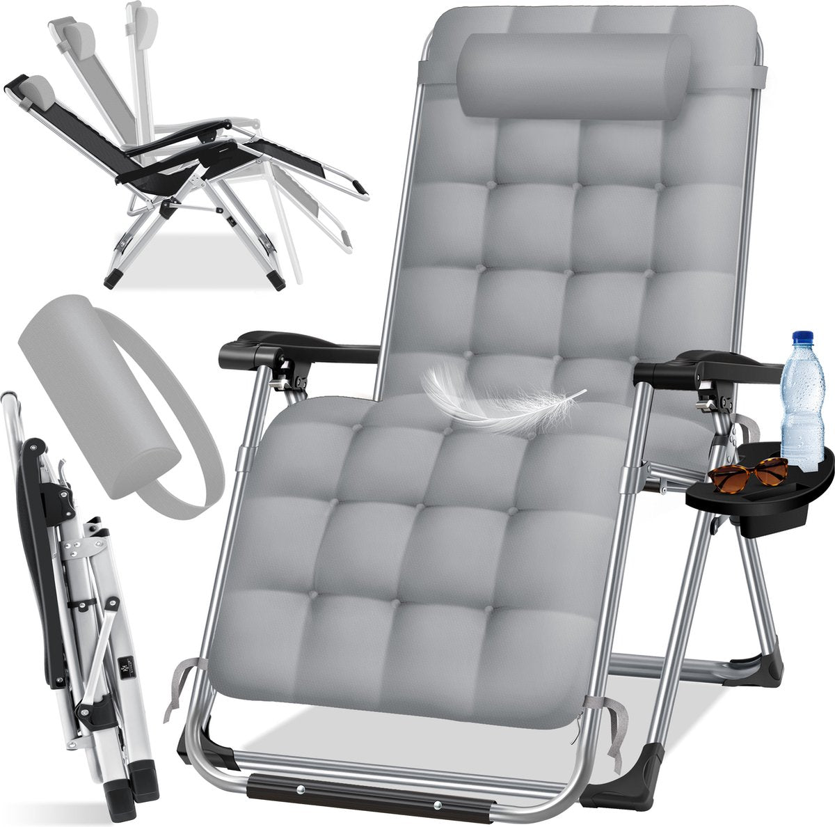 Geniet van de"Zero Gravity" positie en voel je gewichtloos en bevrijd van alle zorgen na een lange werkdag.Met de comfortabele en verstelbare bekleding kun je onbeperkt ontspannen en de positie van het ligbed op elk moment aanpassen.Leun tegen het comfortabele kussen en leg je voeten omhoog.Een geïntegreerde opbergtafel biedt genoeg ruimte voor drankjes, je smartphone of andere kleine voorwerpen.