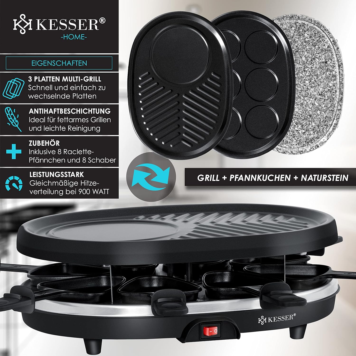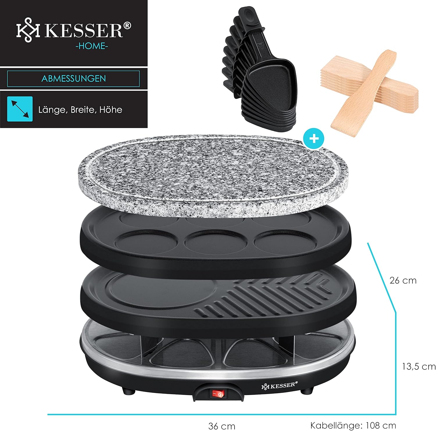 Kesser Raclettegrill met 900 W vermogen, inclusief 8 gourmetpannetjes en 8 schrapers en gelijkmatige warmteverdeling, antiaanbaklaag, natuursteenplaat, grill- en pannenkoekenplaat.