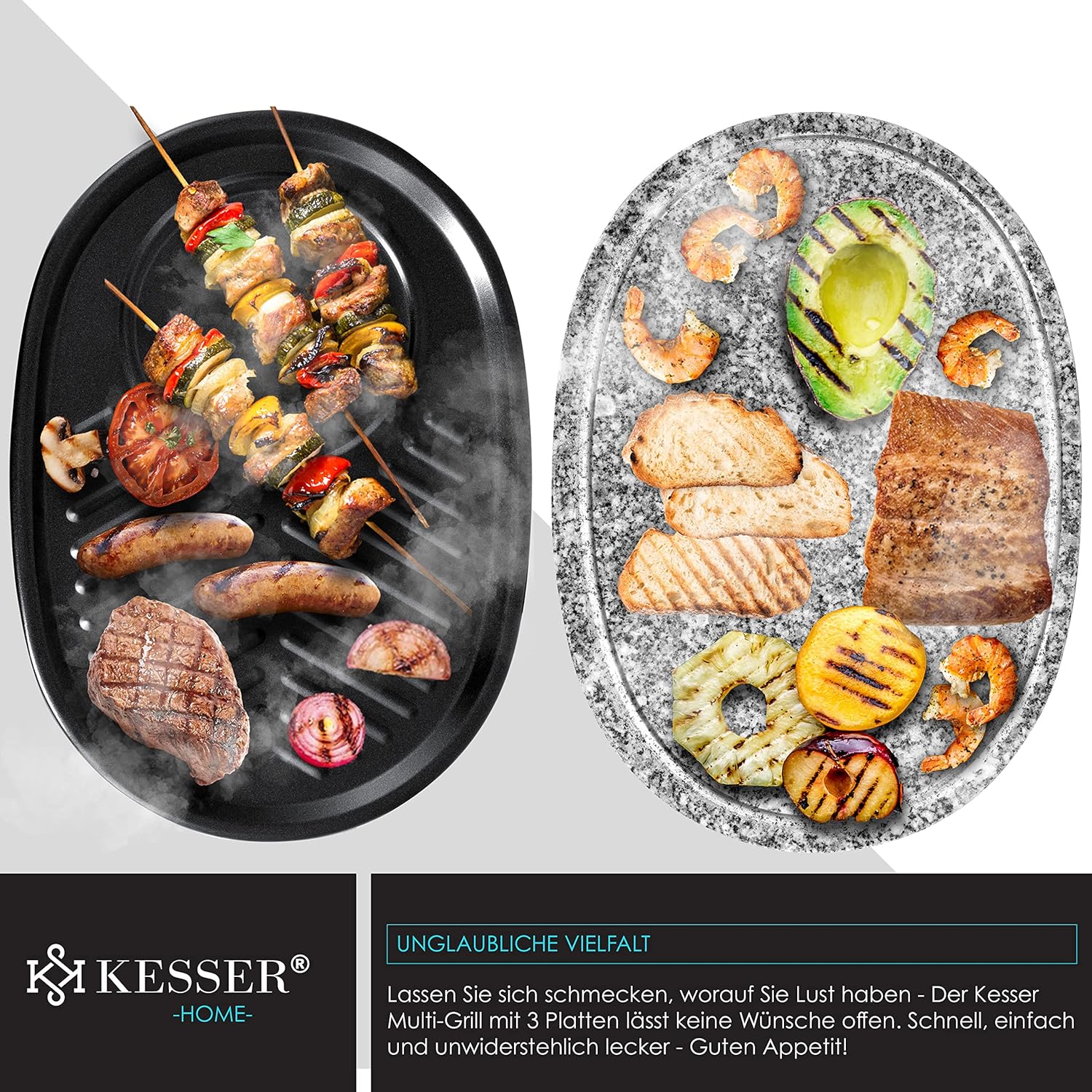 Het bijzondere aan onze grill zijn de drie verwisselbare grillplaten, die heel eenvoudig kunnen worden vervangen en op de houder boven de verwarmingsslang kunnen worden geplaatst. Laat je op onze hoogwaardige natuurstenen plaat ingrediënten zoals vlees, groenten of vis heel vetarm en smaakneutraal grillen. Geniet met onze pannenkoekengrillplaat met antiaanbaklaag van lekkere en perfect gevormde pannenkoeken van de Kesser multi-grill en breng prachtige momenten door met je geliefde.