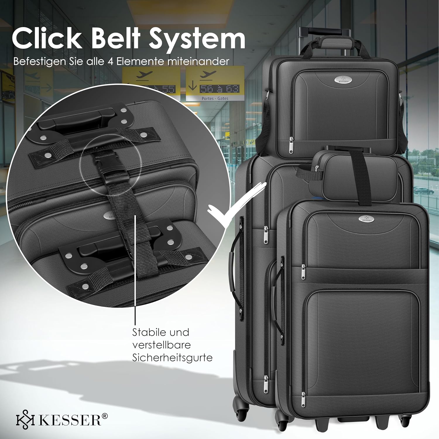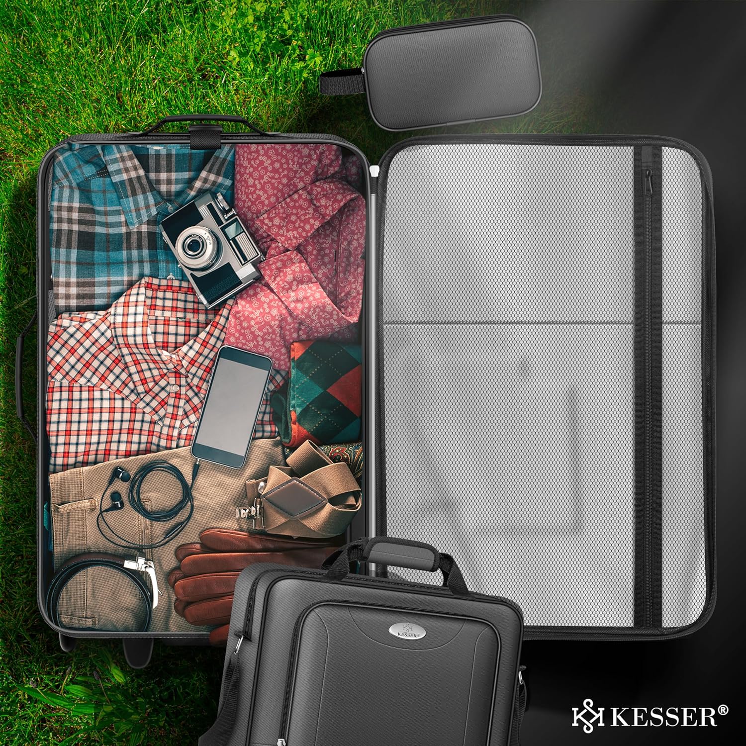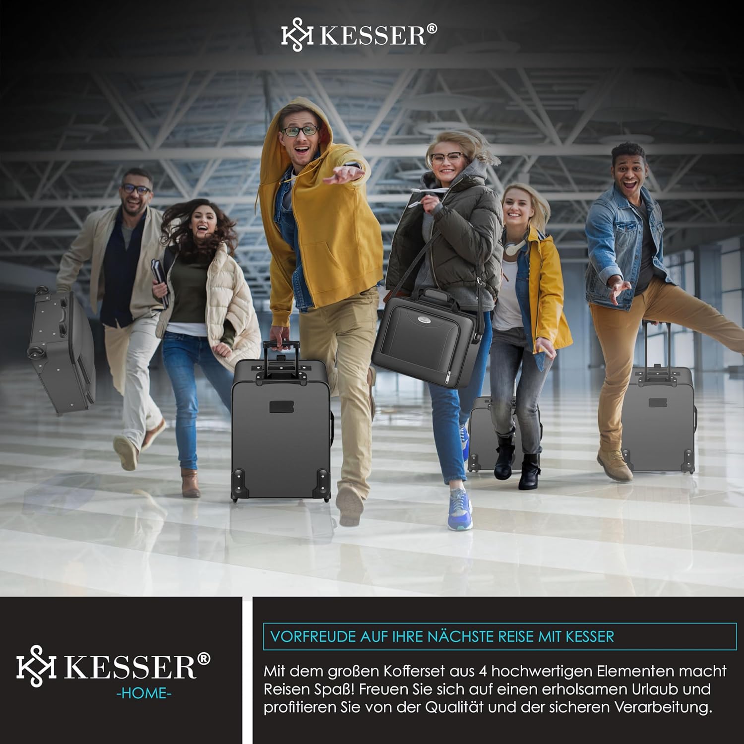 Deze4-delige koffersetvan KESSER laatniets te wensen overen is deperfecte metgezel voor uw volgende vakantie! Detwee koffersbieden volopruimte voor uw kleding, degrote tasis ideaal voor uwlaptop of toiletartikelenen dankzij het handzame formaat is hij perfect alshandbagage. Uwreisdocumenten,smartphoneofportemonneekunt u gemakkelijk meenemen inde kleine tas.