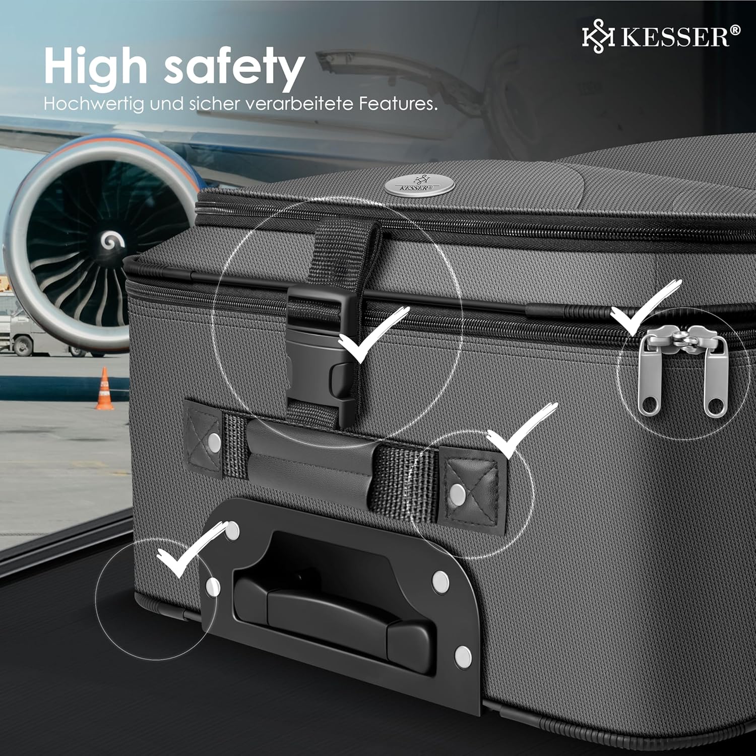 Tijdloos design: de hoogwaardige en veilig verwerkte kenmerken van de kofferset van KESSER laten niets te wensen over, waardoor de koffers een tijdloze en visueel opvallende blikvanger zijn die je ook in de menigte snel herkent.