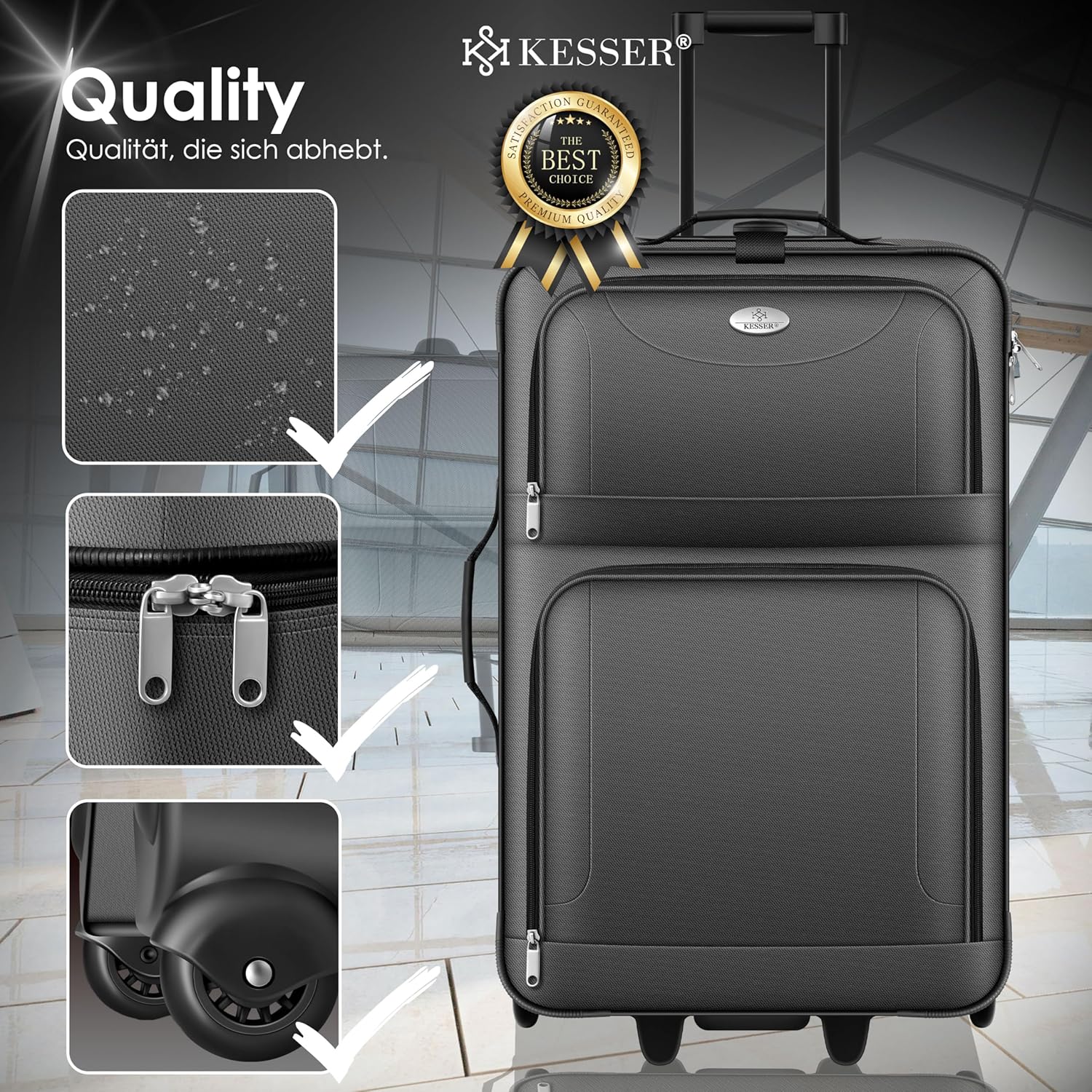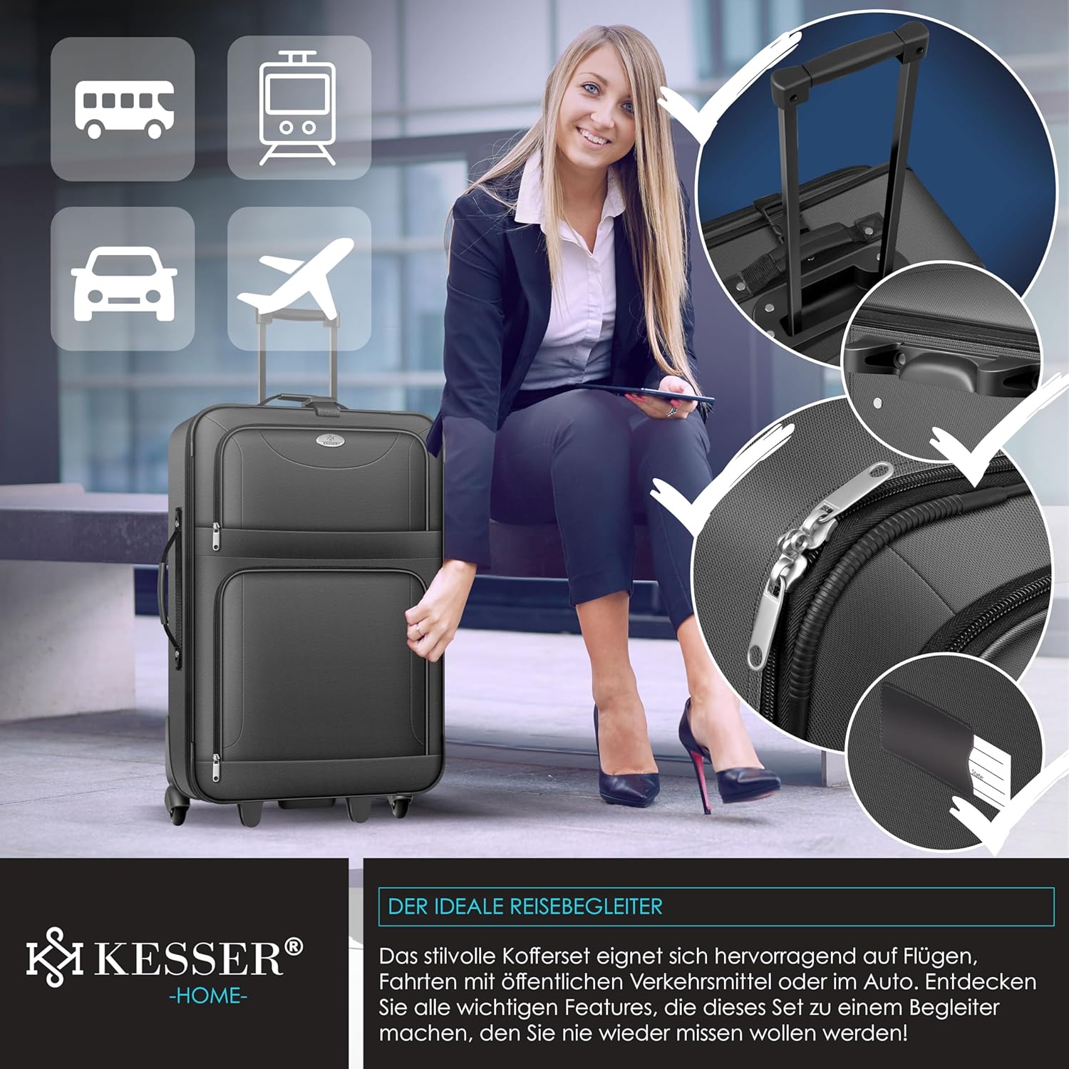 De 4-delige kofferset van KESSER laat qua comfort niets te wensen over! Vervoer uw reisbenodigdheden snel en eenvoudig dankzij de massieve rubberen banden en de telescopische handgreep. De nauwsluitende koffers beschermen hun inhoud met hun veilige, hoogwaardige constructie.