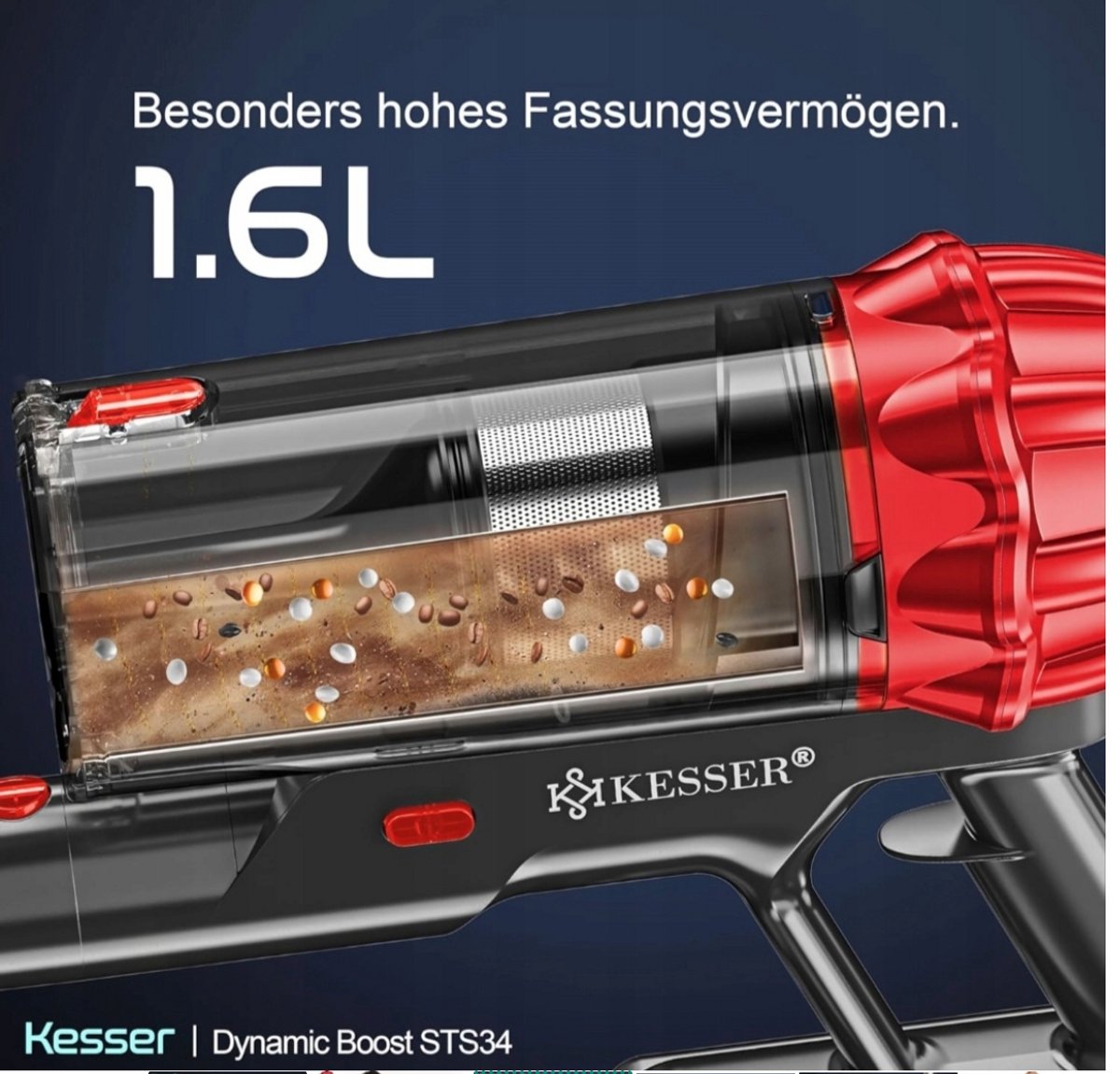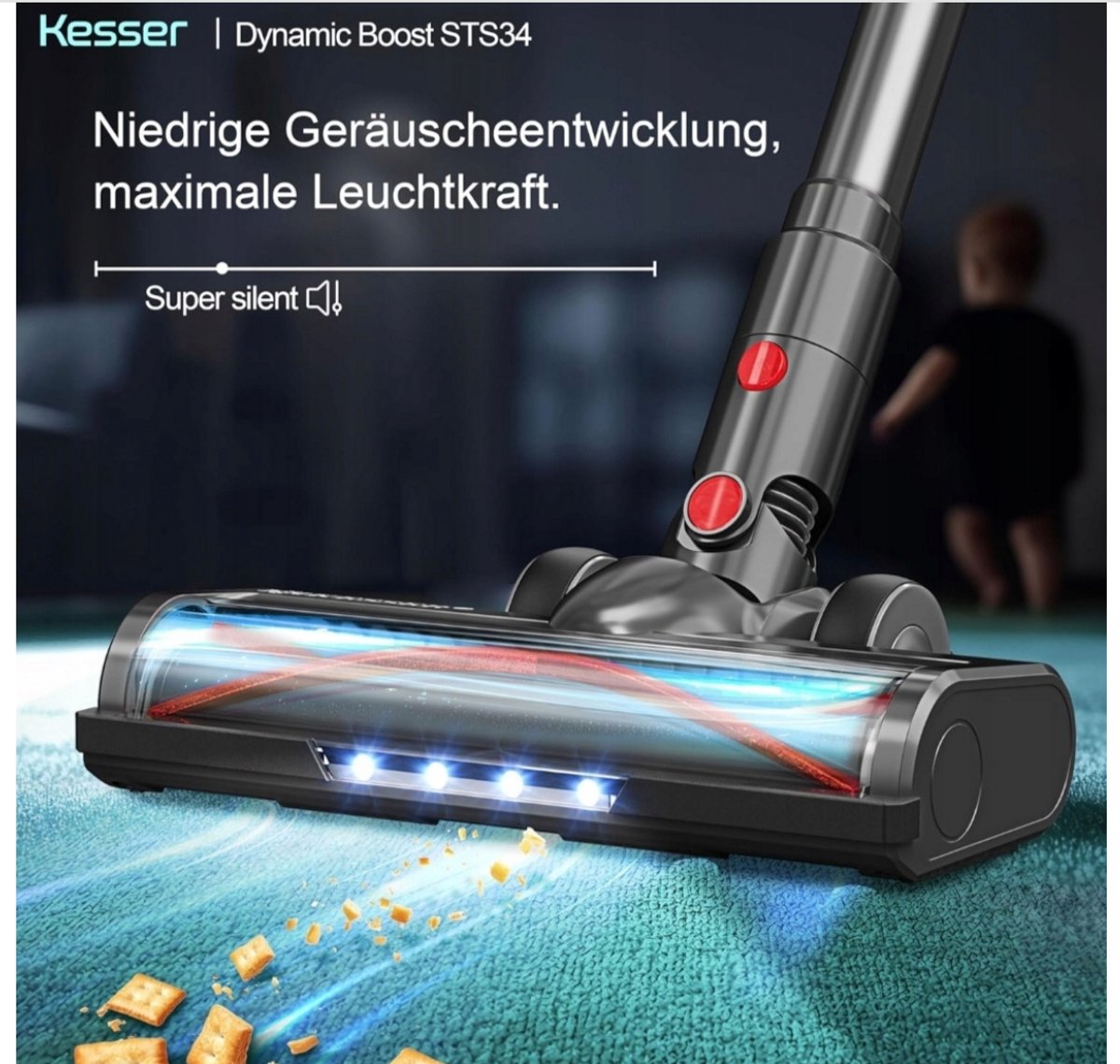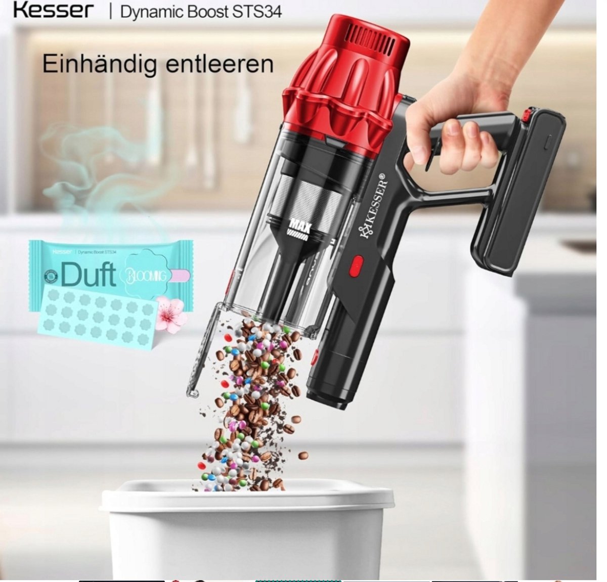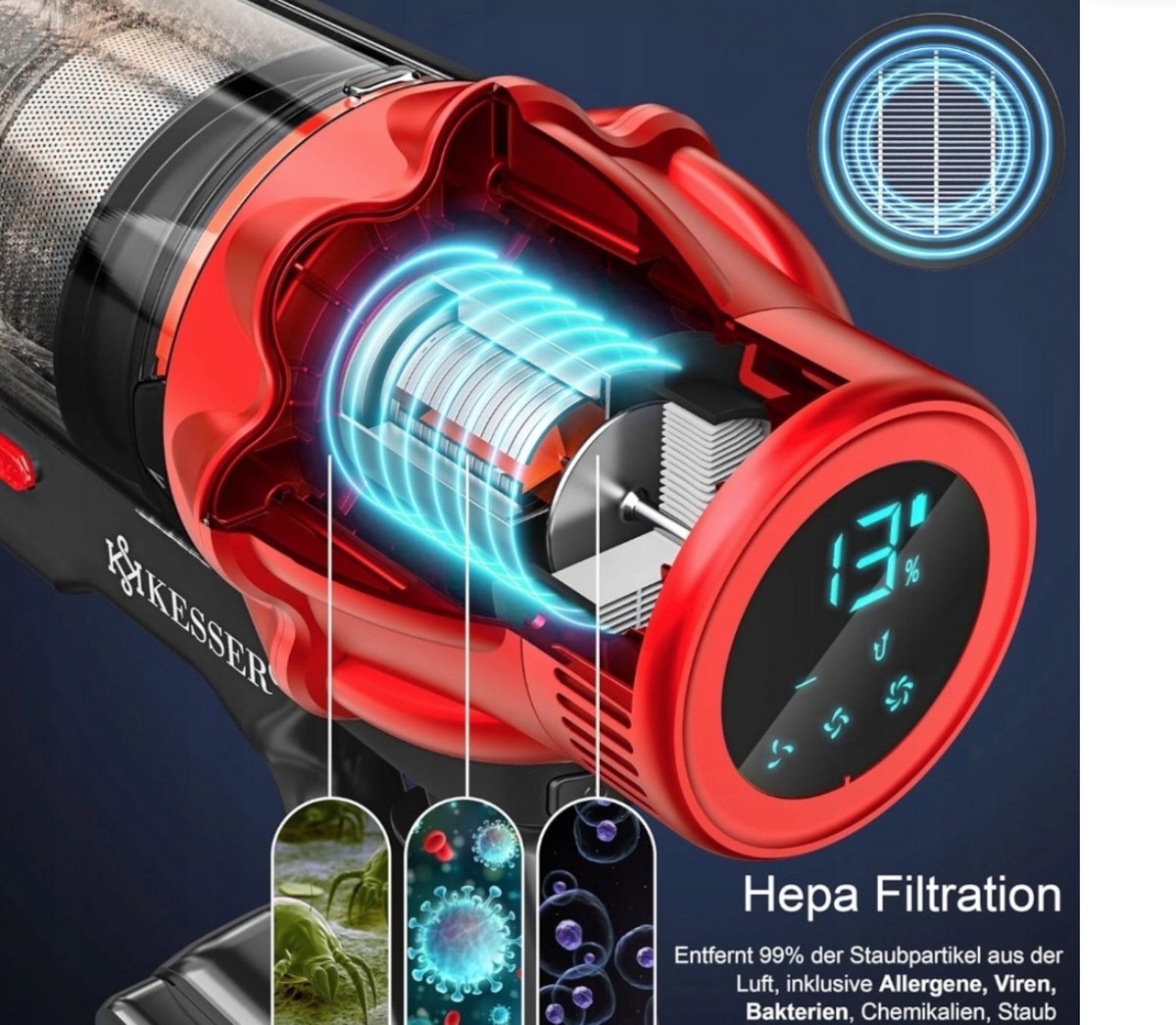 Met een vermogen van 400 W en een zuigkracht tot 30 kPa verwijdert de KESSER stofzuiger moeiteloos stof, vuil en haren. De krachtige STS34-motor zorgt voor een effectieve verwijdering van zelfs hardnekkig vuil - ideaal voor tapijt, tegels, houten vloeren en laminaatvloeren.