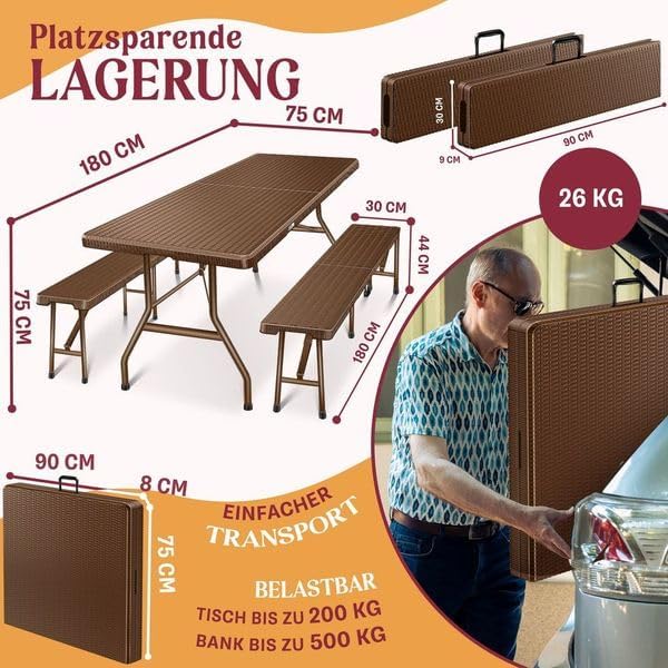Afmetingen tafel opgebouwd (h x b x d): ca. 73 x 180 x 75 cm. Afmetingen tafel ingeklapt: ca. 90 x 75 x 9 cm. De tafel weegt ca. 12,7 kg. Afmetingen per bank opgebouwd: ca. 44 x 180 x 25 cm. Afmetingen per bank ingeklapt: ca. 90 x 25 x 9 cm. Elke bank weegt ca. 9,3 kg. Totaal gewicht van de set: ca. 31 kg. Maximale belasting van de tafel bedraagt 120 kg. Maximale belasting van elke bank bedraagt 500 kg. Snel ingeklapt en dankzij de draaggreep gemakkelijk te transporteren