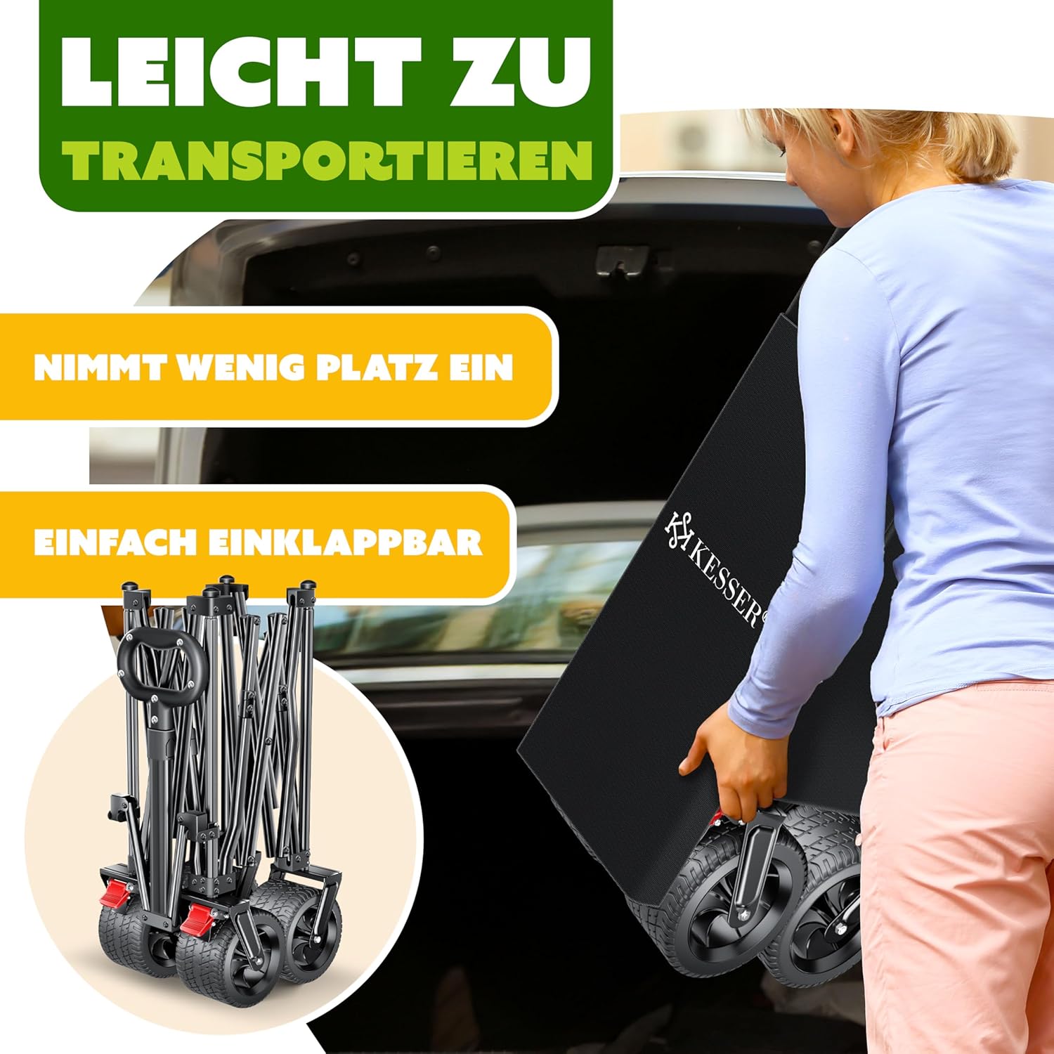 • Meer transportwonder: de KESSER Wheely GTR9000 bolderkar biedt een opbergruimte van 300 liter en een draagkracht van 200 kg en is daardoor ideaal voor boodschappen, uitstapjes en tuinieren. Inclusief zijvak en bekerhouder.
