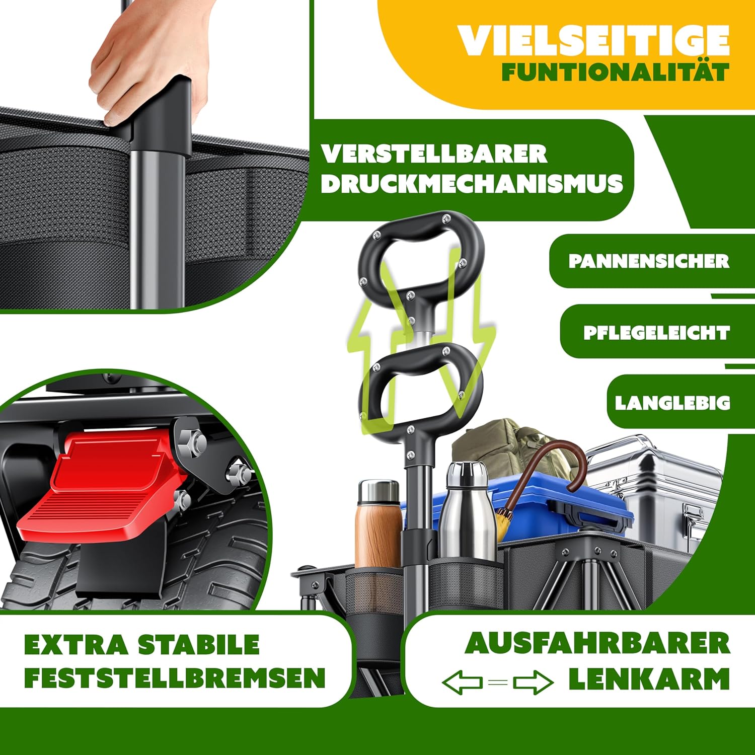 • Eenvoudige montage en ruimtebesparend: de bolderkar kan eenvoudig worden gemonteerd en ruimtebesparend worden ingeklapt als hij niet wordt gebruikt. Ideaal voor eenvoudig transport en opslag.