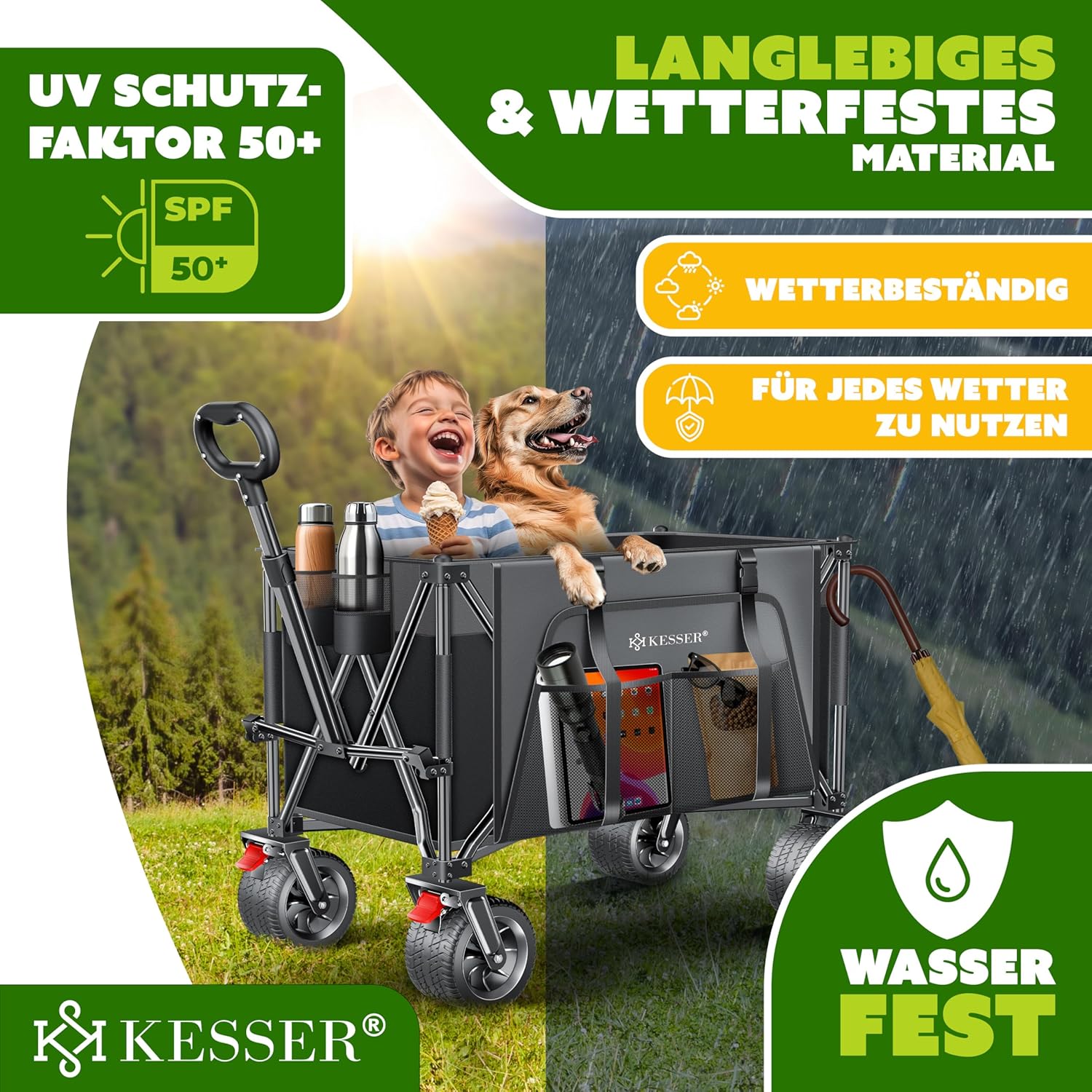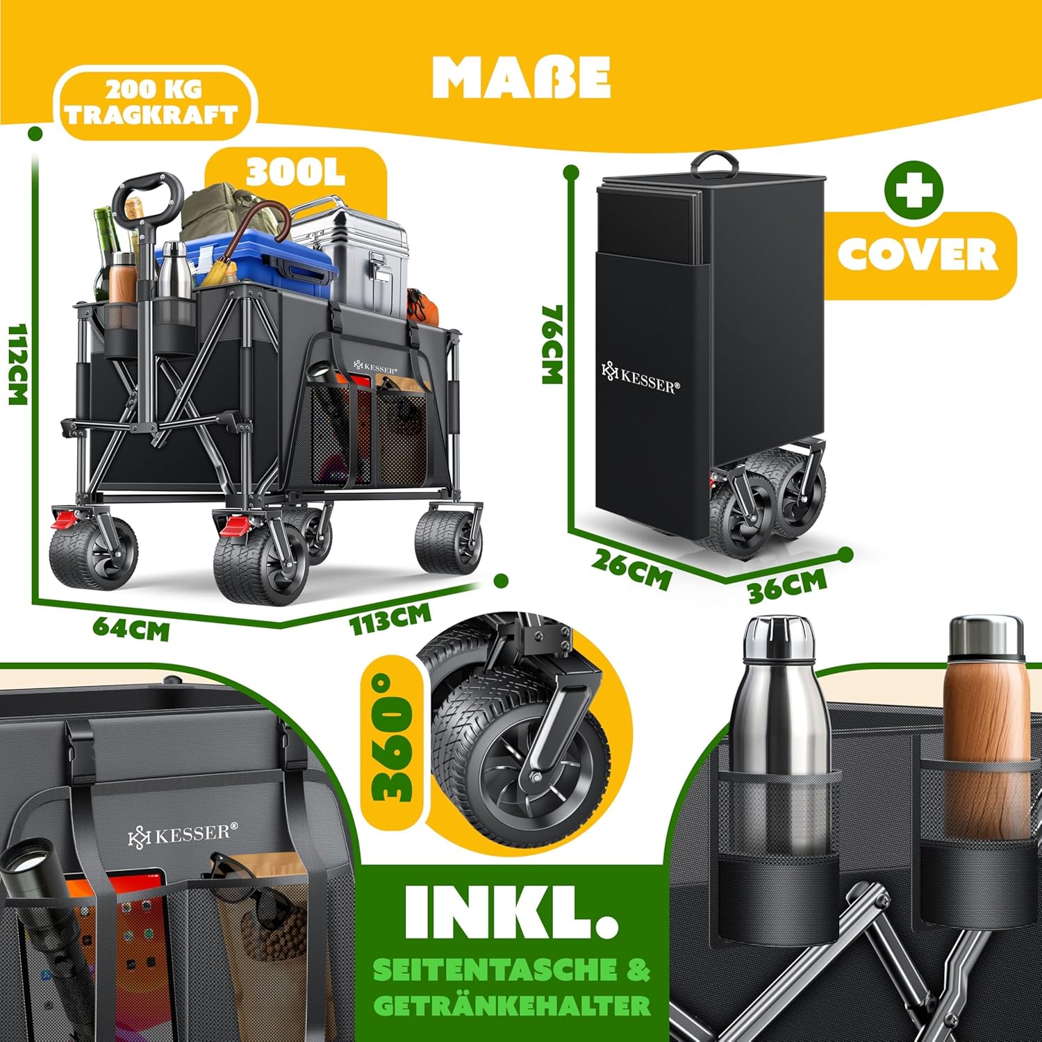 KESSER® Bolderkar, GTR9000, handwagen, 200 kg, 300 liter opbergruimte, transportwagen, opvouwbaar, extra brede 360° wielen en parkeerremmen, weerbestendig, strandwagen, incl. afdekking, zijzak en
