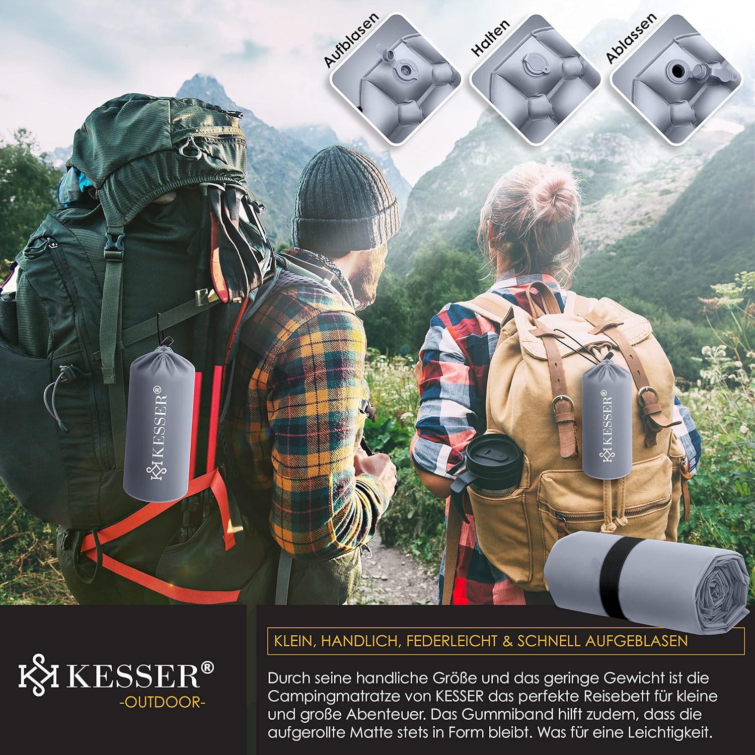 KESSER campingmatras met innovatief luchtkamerhoningraatsysteem, scheur- en slijtvast, water- en weerbestendig dankzij TPU-coating, max. belasting 200 kg, incl. draagtas en reparatieset.