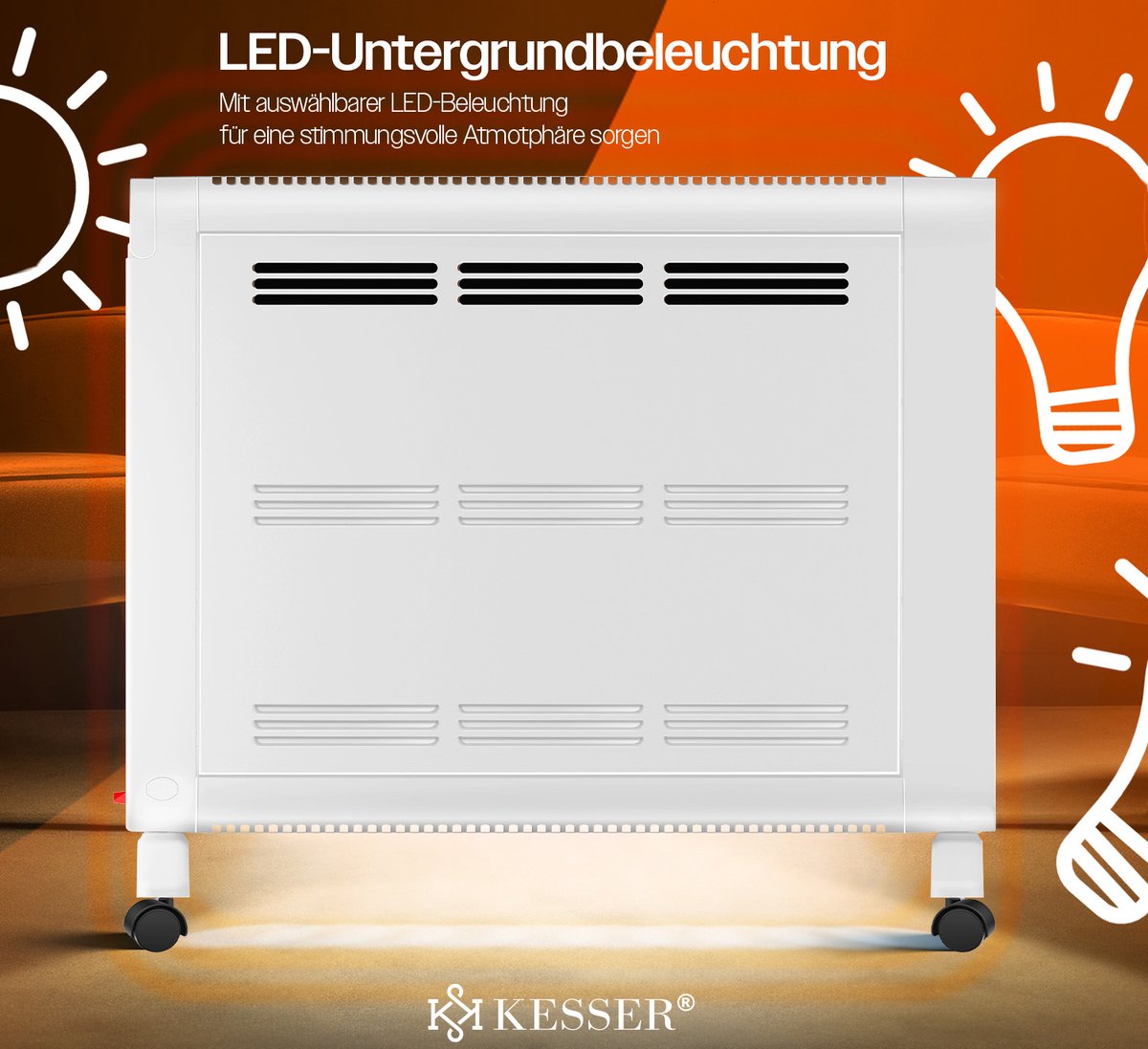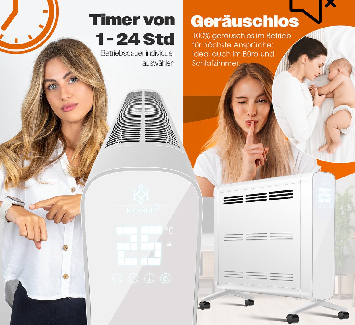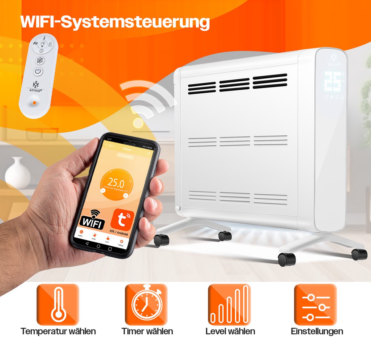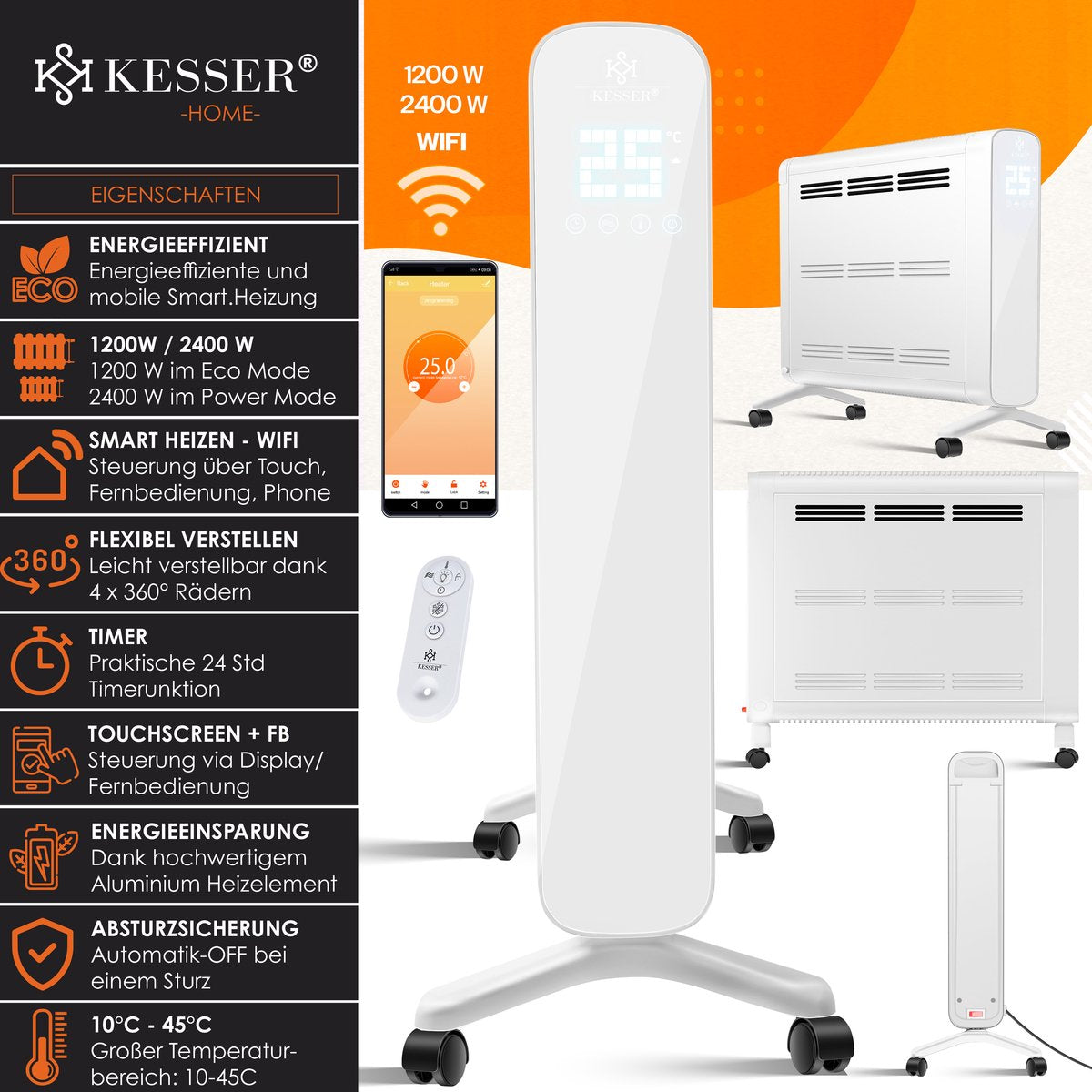 KESSER Convector Kachel Vermogen van 1200W in Ecomode en 2400W in Power Mode, gecombineerd met Smart Heating WiFi-functie voor flexibele bediening via touch display, afstandsbediening of smartphone app, mobiliteit dankzij 360° wielen, praktische 24-uurs timerfunctie