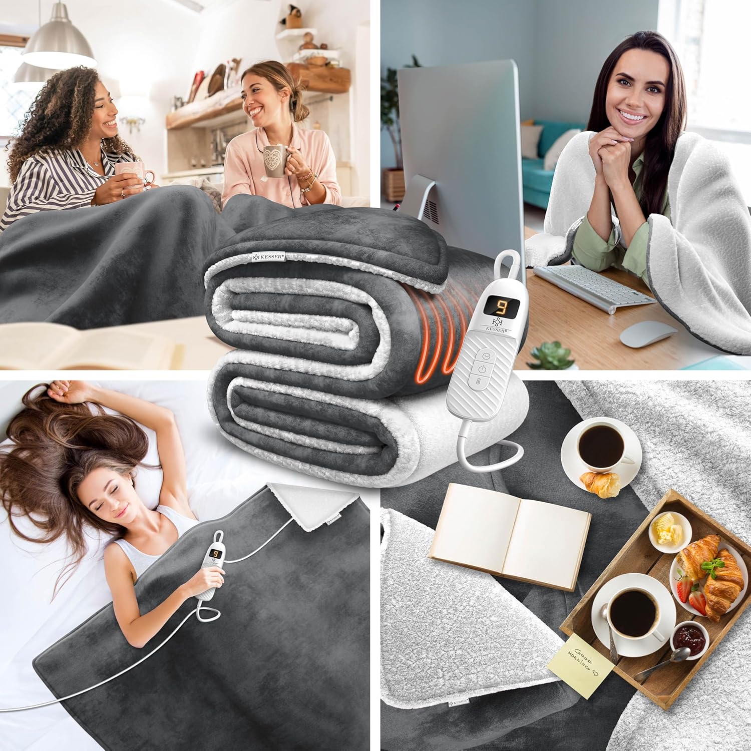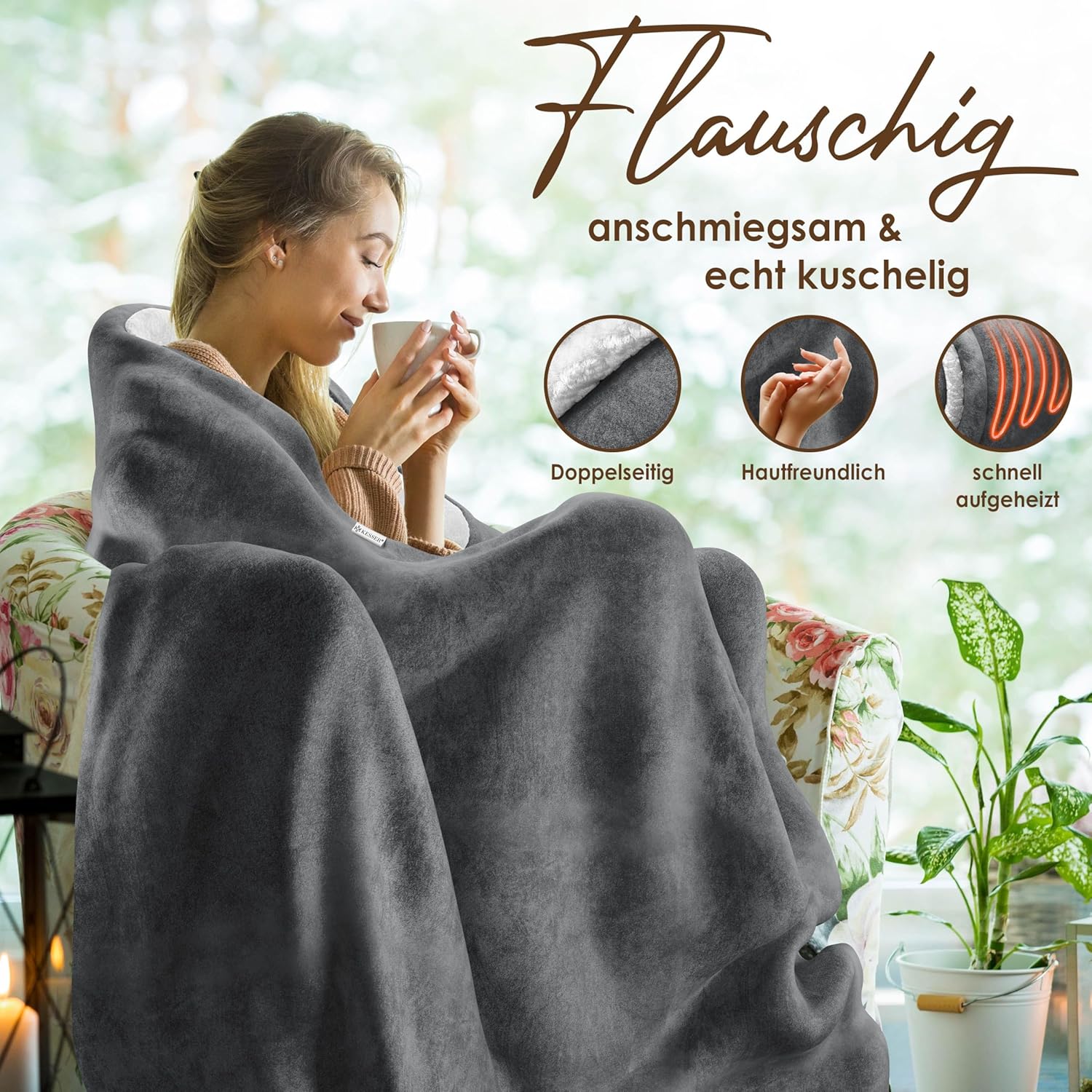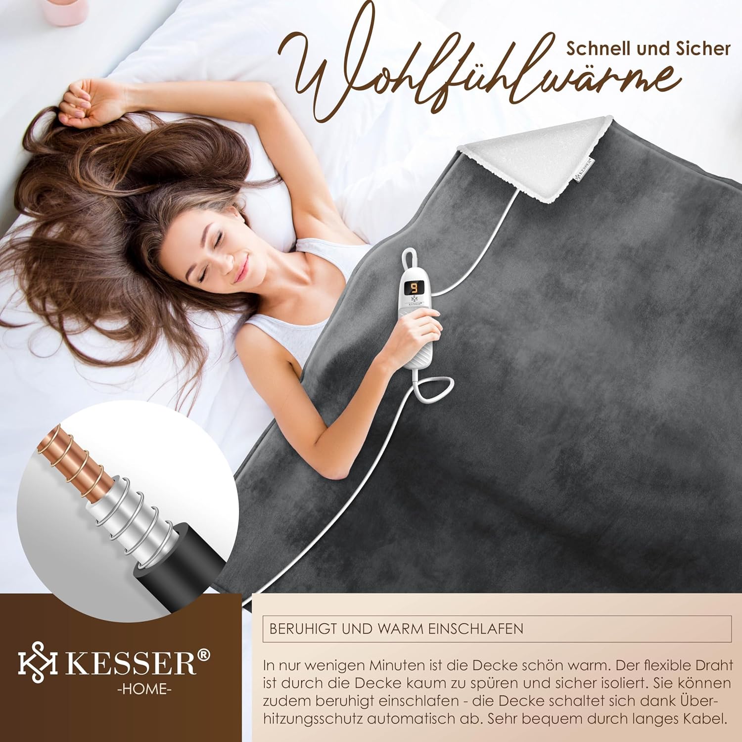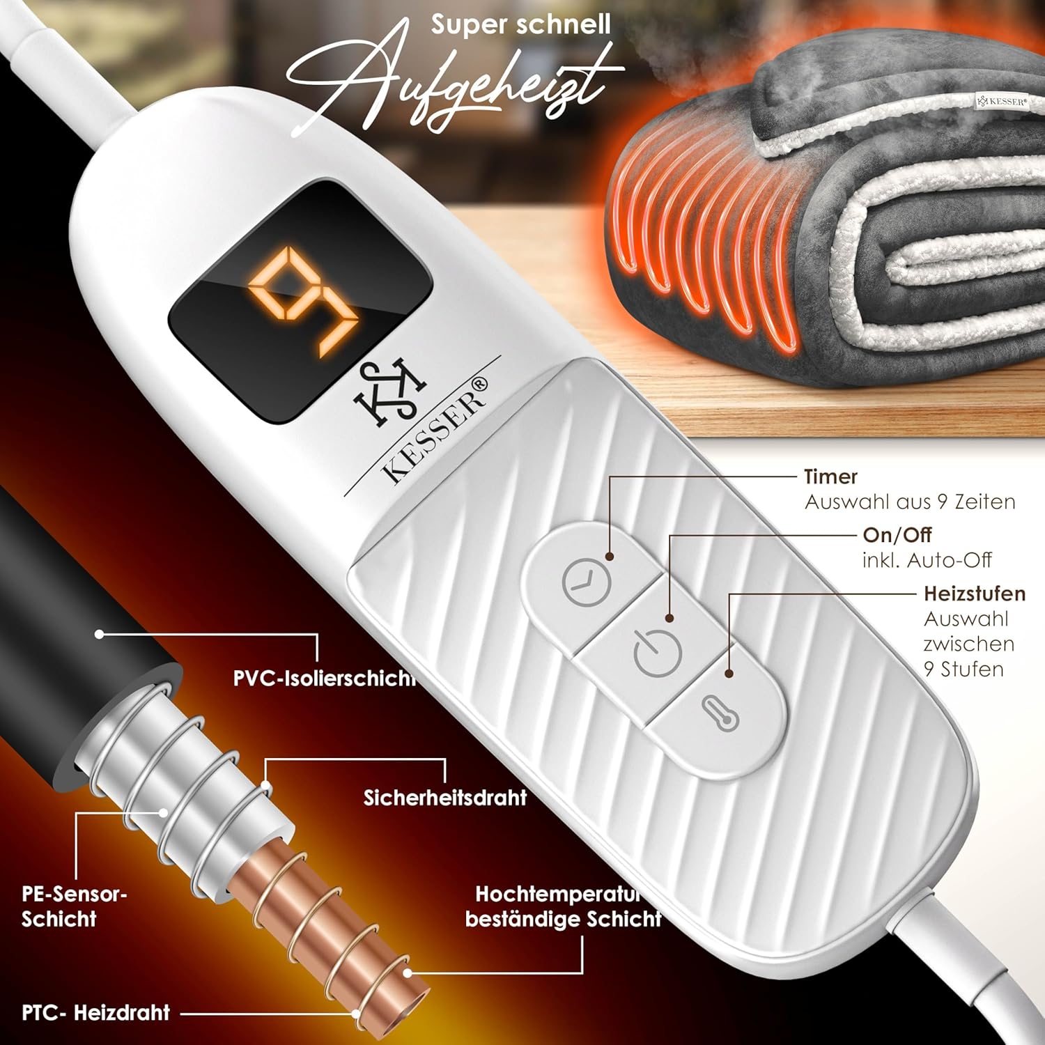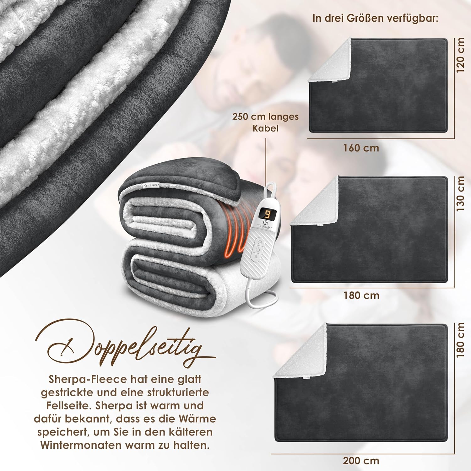 KESSER® Elektrische deken met automatische uitschakeling, 160 x 120 cm, dubbelzijdig elektrische warmtedeken, knuffeldeken, bed, bank, 9 temperatuurniveaus, wasbaar tot 40 °C, met timer, digitaal