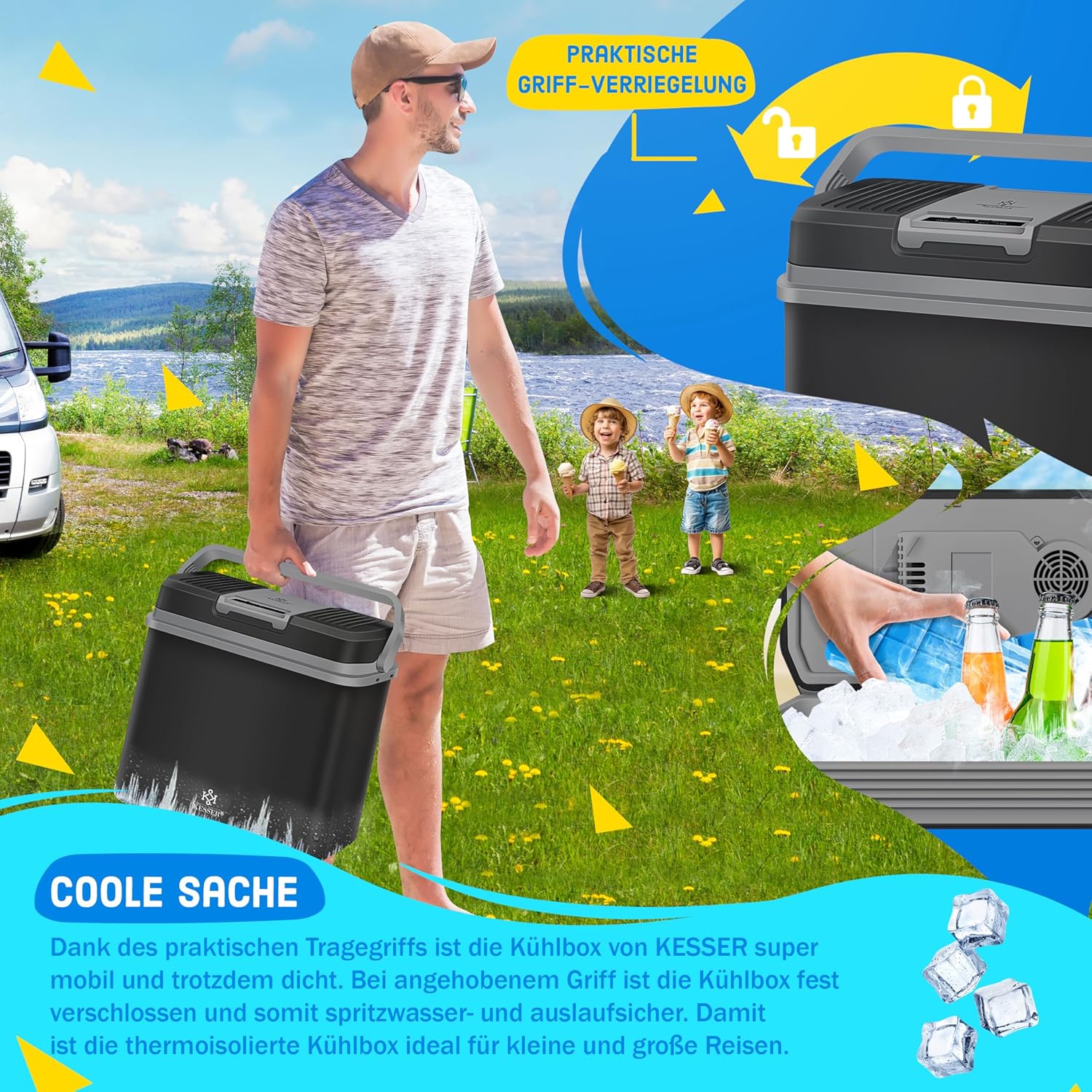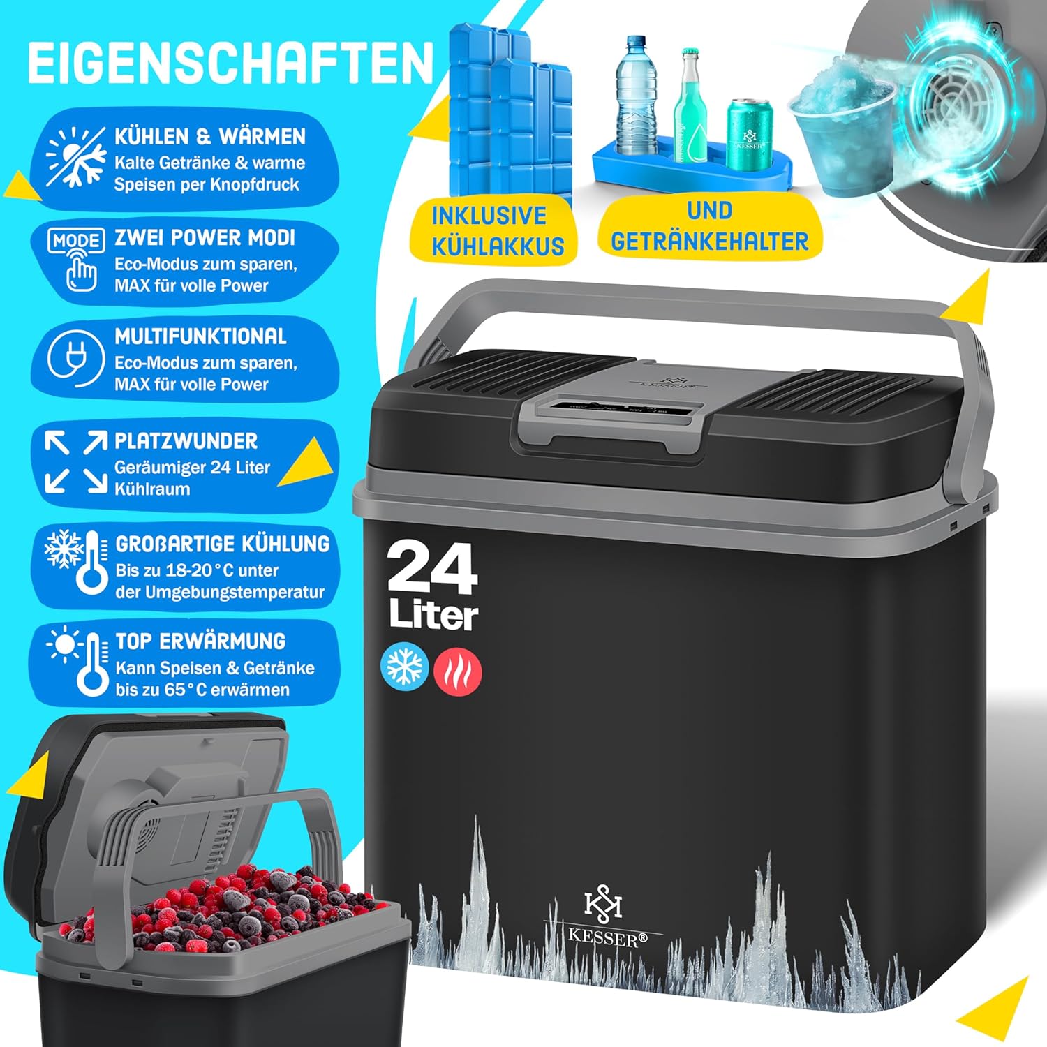 KESSER KE-24L Thermo-elektrische koelbox. De Kesser koelbox van 24 liter biedt je koude dranken in de zomer en warme gerechten in de winter. Dit veelzijdige product is uitgerust met een koel- en warmtefunctie. Dankzij de thermostaatgeregelde warmhoudfuncties kunnen levensmiddelen tot een temperatuur van 65 °C warm worden gehouden. Productvoordelen: thermo-elektrische koelbox van 24 liter. Om warm te blijven, opwarmen en afkoelen. 12 V en 230 V stopcontact door geïntegreerde AC/DC-transformator. Holle handgreep in het deksel, dekselopening in 2 standen mogelijk. Draaggreep, ook om het deksel te vergrendelen. Energieverbruik volgens energie-efficiëntieklasse: 70 kWH per jaar. Maximaal geluidsniveau bij 35 dB, in extra stille ECO-modus. 2 programma's: koud, warm 2 standen: Eco (alleen voor 230 V), max. Verwisselbare zekering (T6,3AL250V) in 12 V universeel stopcontact ter bescherming van de koelbox. Rood ledlicht in warme modus en groen ledlicht in de koude modus. Eenvoudig te bedienen en klaar voor gebruik met 2 schakelaars. Ruimtebesparend: 37 x 24 cm. Isolatiegas Cyclopentan C5H10 voor een betere isolatie. Kabelopbergvak, altijd alles binnen handbereik en klaar voor gebruik. Vermogen: 58 W, ECO-modus 8 W. Maximale hoogte fles: 34 cm. Afmetingen: kabellengte 230 V, stekker 1,4 m. Kabellengte: 12 V: 1,6 m. Binnenkant: 34 x 18 x 34 cm (b x d x h). Buitenafmetingen: 37 x 24 x 43 cm (b x d x h). Inhoud: koelbox met 230 V-stekker en 12 V-stekker.
