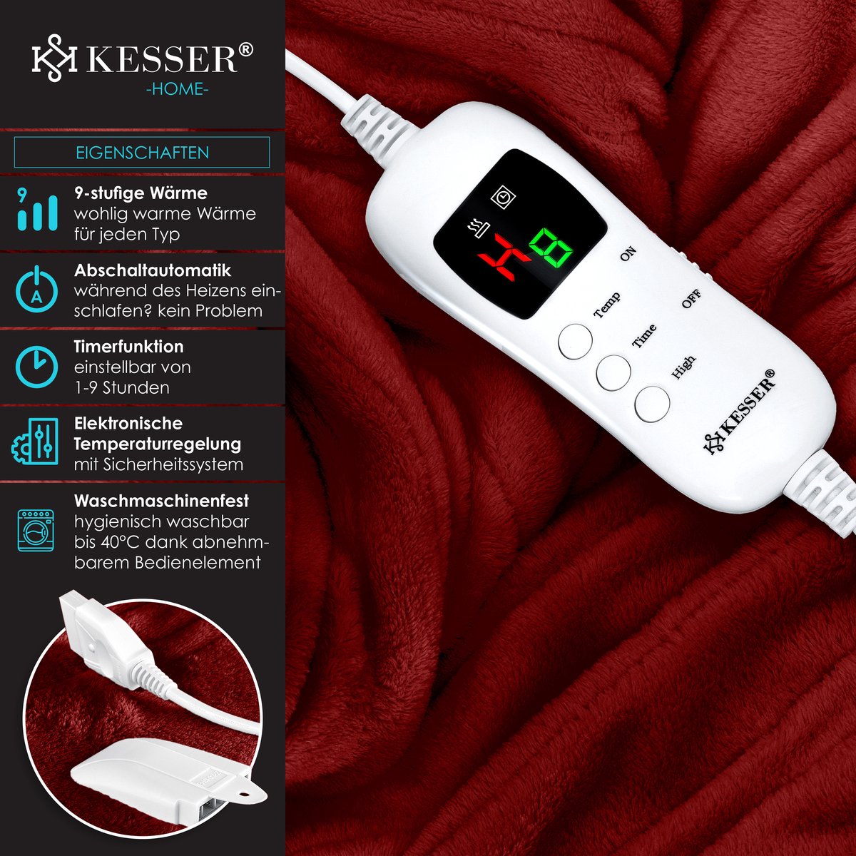 KESSER verwarmingskussen, incl. afstandsbediening, groot verwarmingsoppervlak, 9 verwarmingsstanden en timer, oververhittingsbeveiliging, automatische uitschakeling, ademend, multifunctioneel.