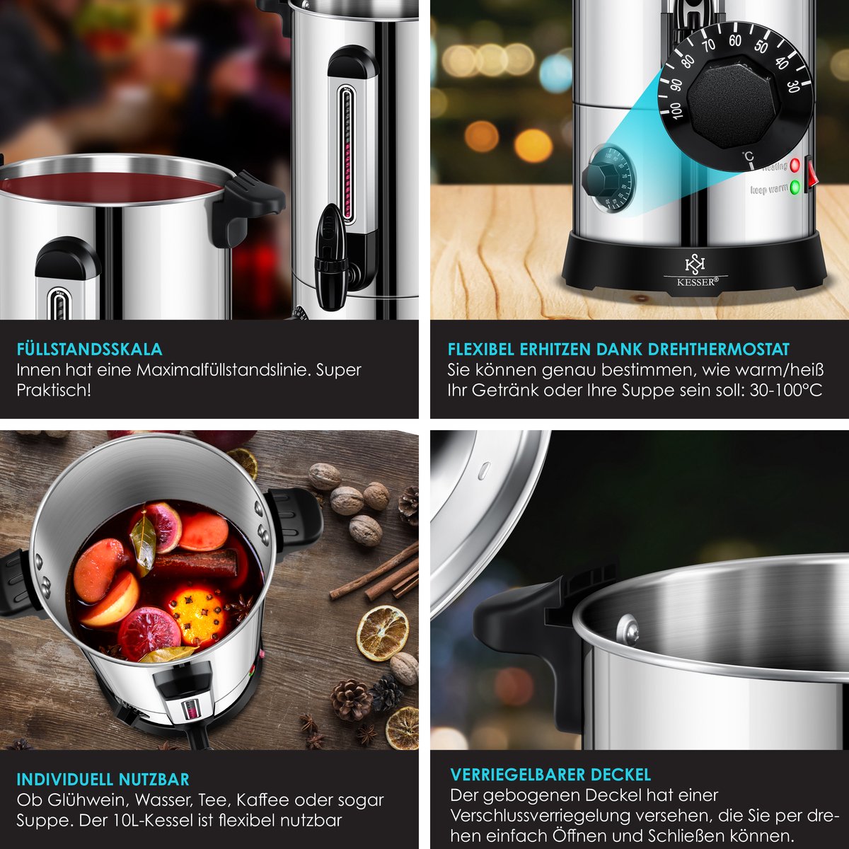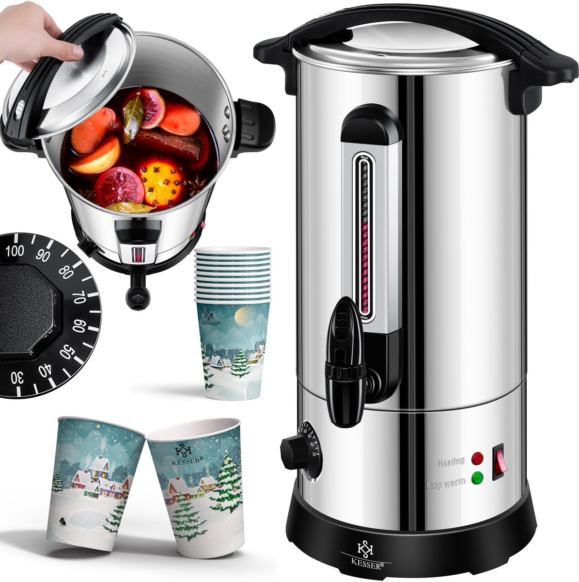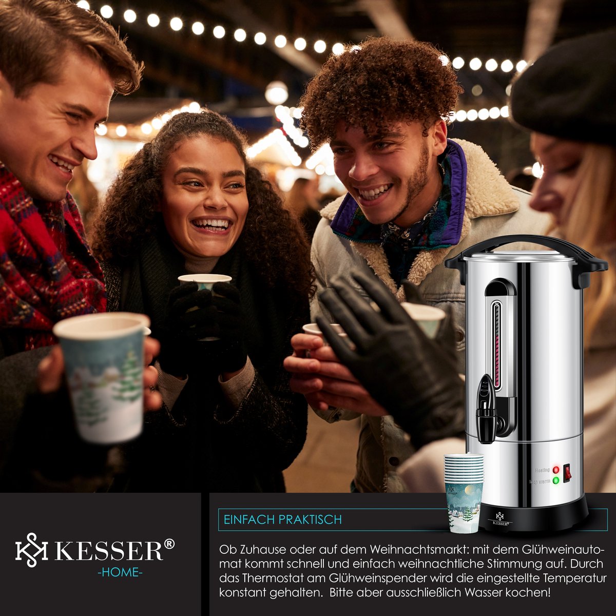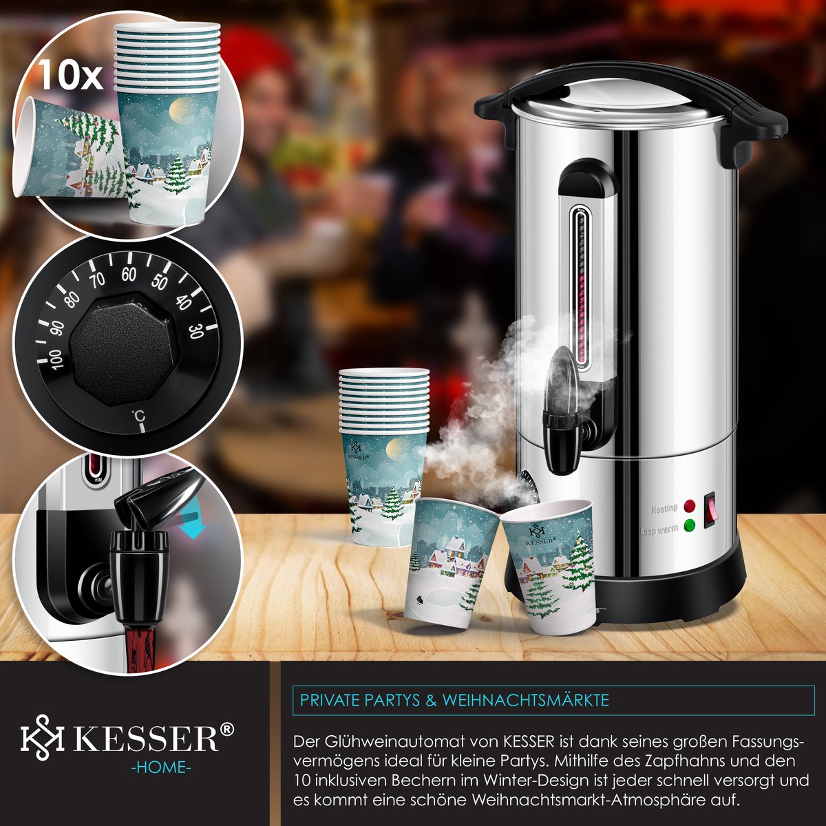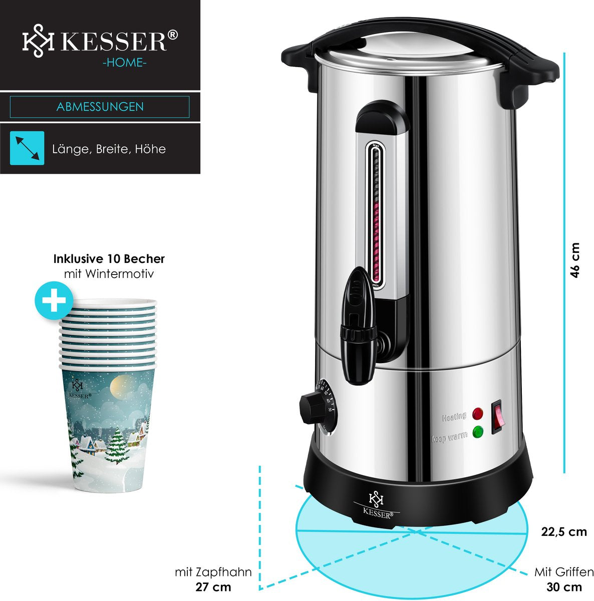 KESSER Glühwein dispenser 1800W met 10 liter inhoud, 30-100°C voor automatisch verwarmen en warm houden van vloeistoffen, roestvrijstalen behuizing, geen blijvende geurtjes, schaalverdeling met maximale vulhoogte en praktische kraan, thermostaat, veilige oververhittingsbeveiliging en 10 bekers met wintermotief