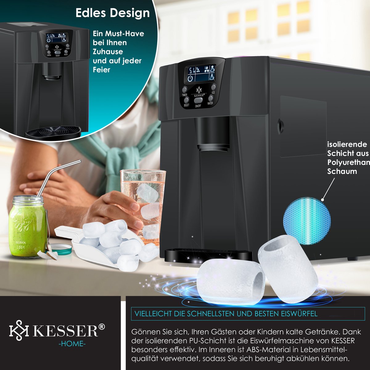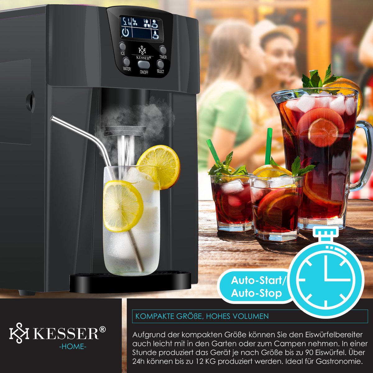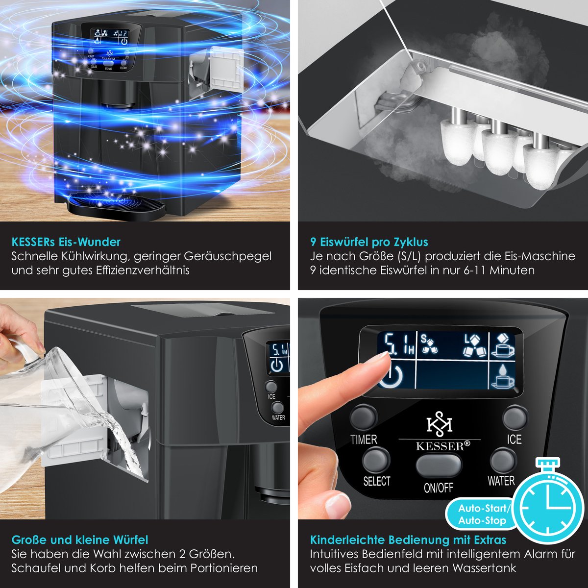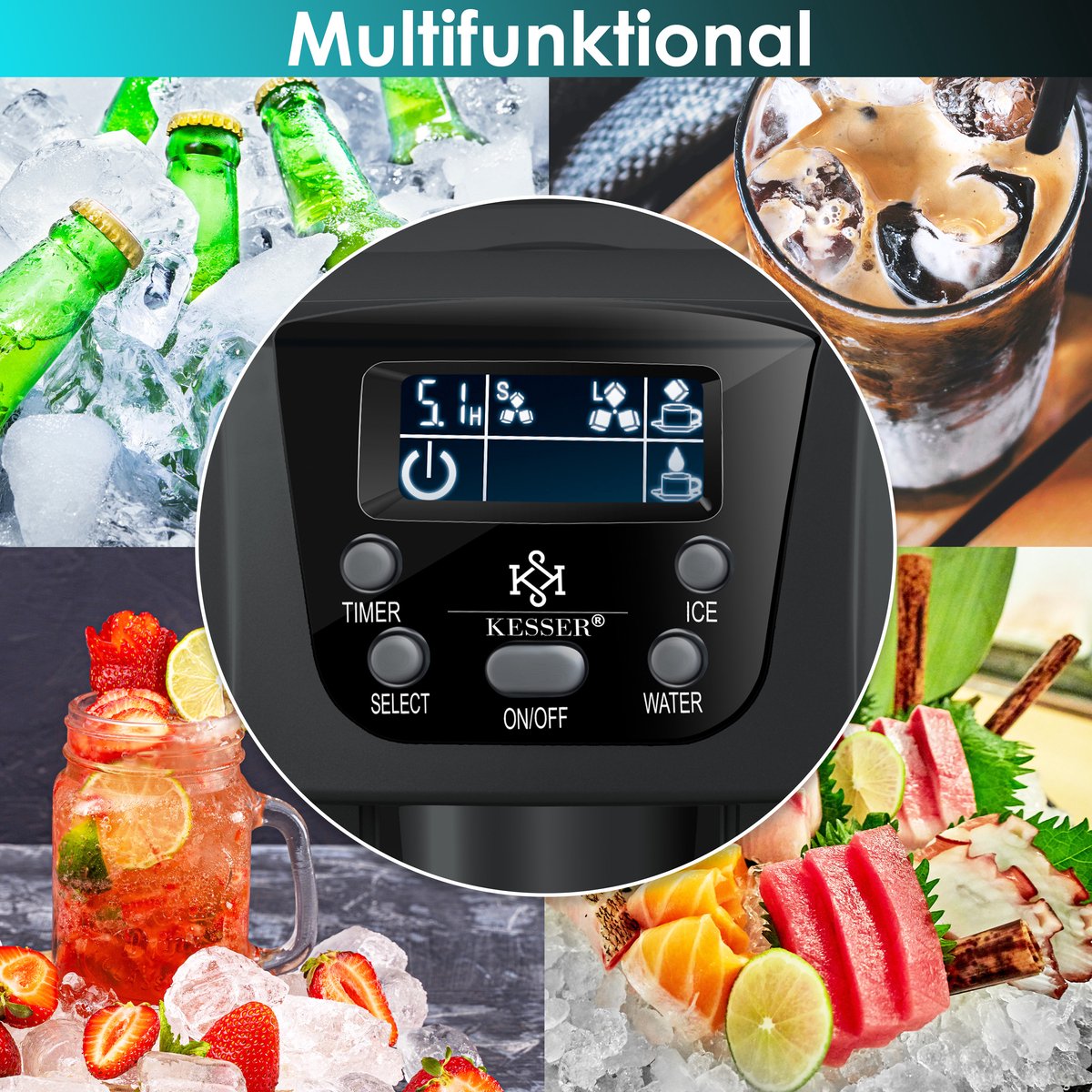 KESSER IJSBLOKJESMACHINE, ijsblokjes in slechts ongeveer 6-8 minuten en tot wel 12 kg klaar in 24 uur, eenvoudige bediening via een 5-knops LCD-scherm, inclusief timer en veiligheidsschakeling.