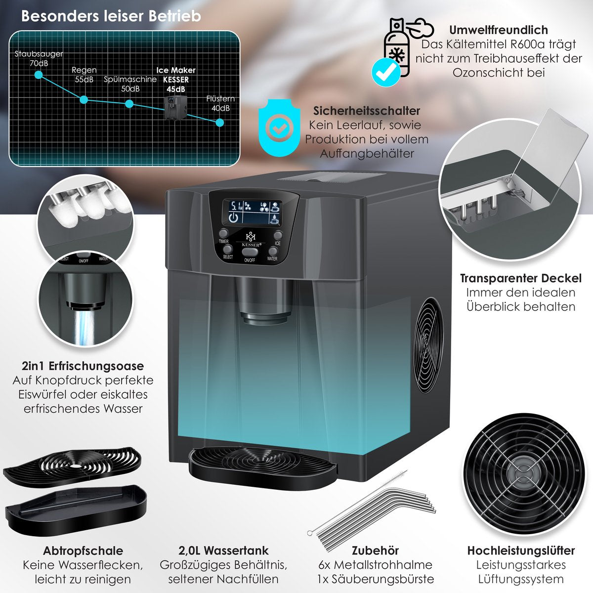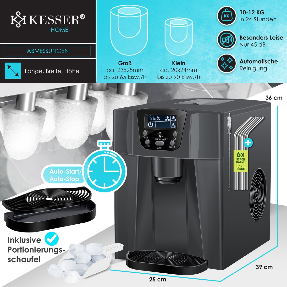 KESSER® IJsblokjesmachine | Roestvrijstalen IJsblokjesmaker | 100W Ice Maker | 12 kg in 24 uur | 2 Kubusmaten | Bereiding in 6 minuten | 2 Liter Watertank | Timer | LCD-scherm | Watertank