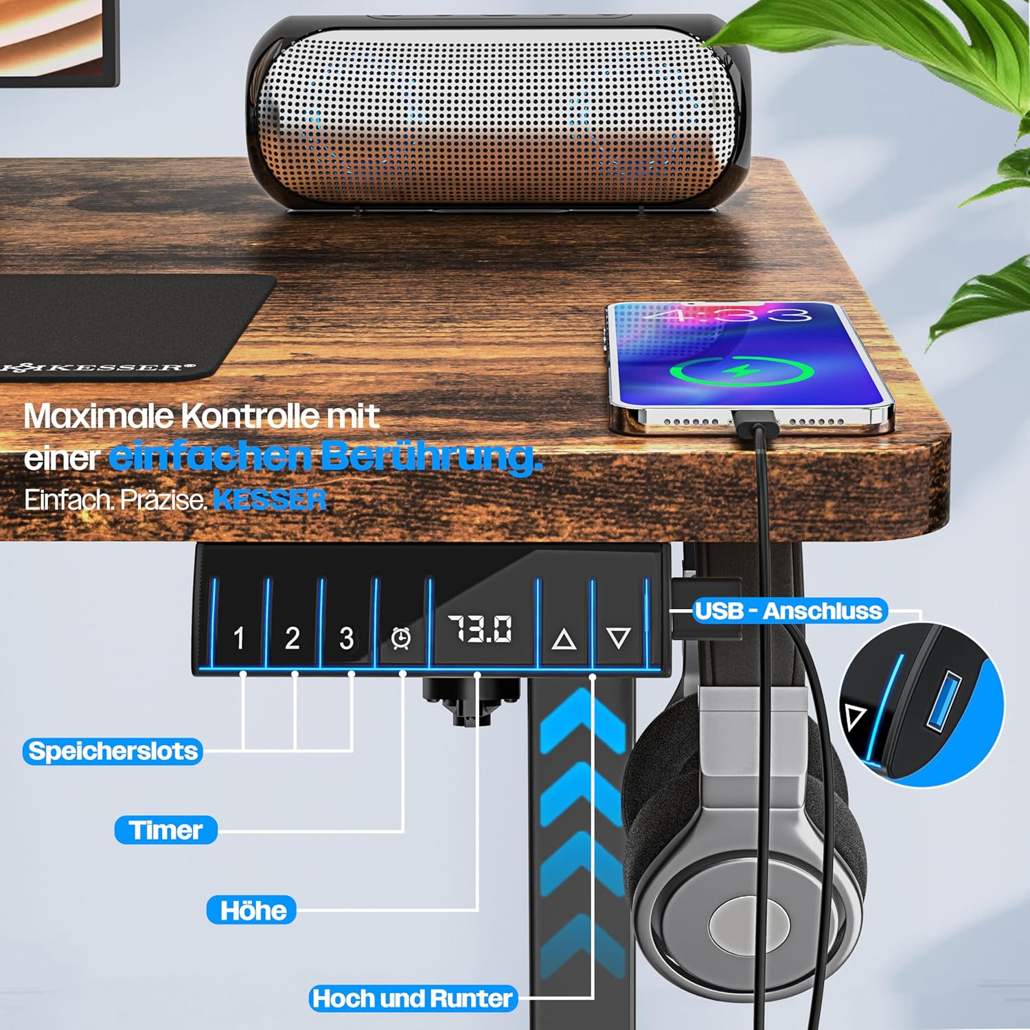 - Eenvoudige bediening en geïntegreerde aansluiting: Met de intuïtieve bediening door aanraking kun je het bureau snel en eenvoudig in de gewenste positie brengen. De geheugensleuven maken het opslaan van je favoriete hoogtes mogelijk. De geïntegreerde USB-poort zorgt ervoor dat je apparaten altijd opgeladen en klaar voor gebruik zijn, zonder dat je extra opladers of verwarde kabels op je bureau nodig hebt.