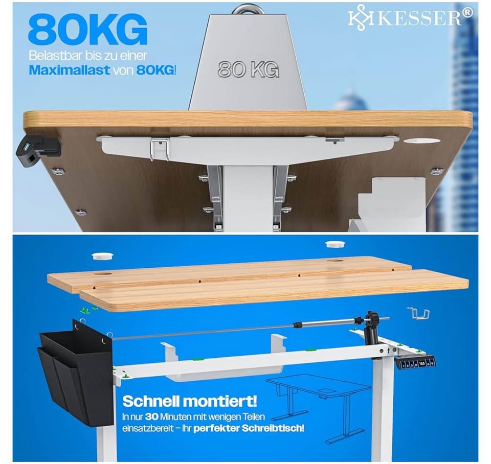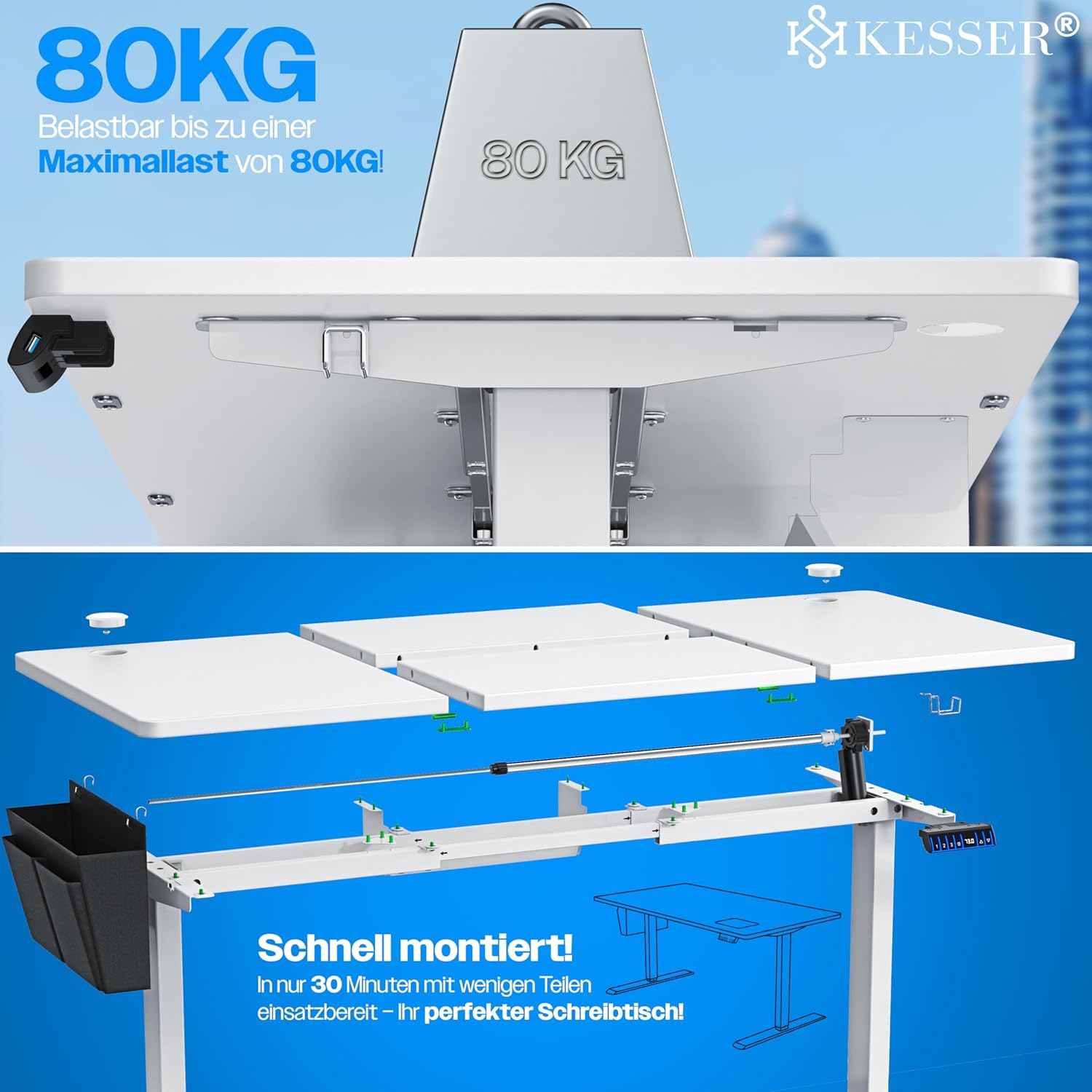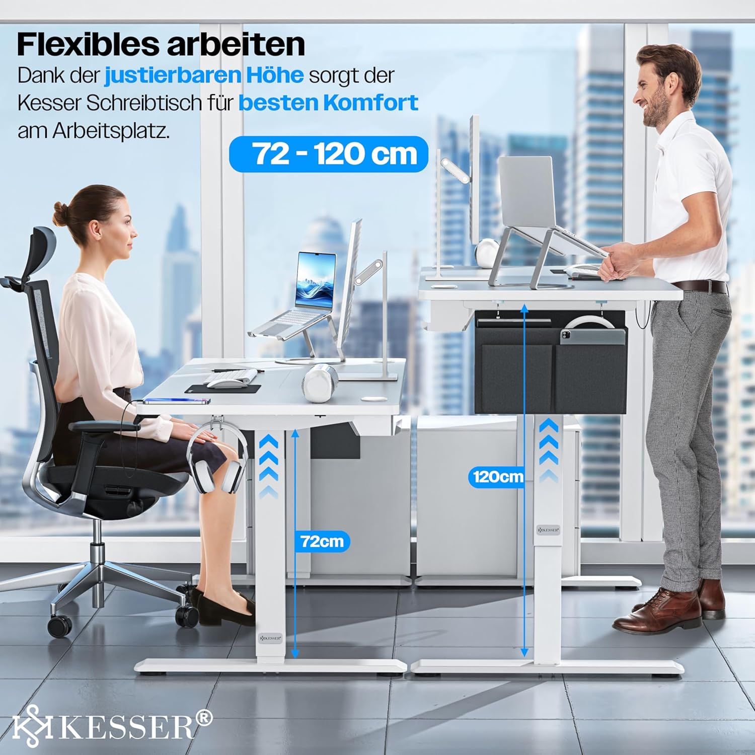 Premium kwaliteit en uitstekende kwaliteit: gemaakt van hoogwaardige materialen, biedt het KESSER bureau een lange levensduur en een stille ervaring bij het verstellen van de hoogte. De zachte lifting-technologie en de 360° wielen maken het bureau ideaal voor gebruik in grote kantoren, vergaderzalen en individuele kantoren. Verkrijgbaar in verschillende kleuren en maten, past hij perfect bij je kamer en je eisen.