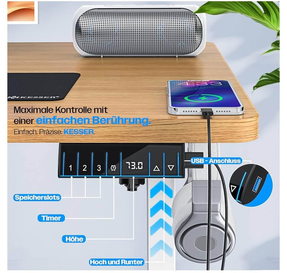 Eenvoudige bediening en geïntegreerde aansluiting: met de intuïtieve bediening door aanraking kun je het bureau snel en eenvoudig in de gewenste positie brengen. De geheugensleuven maken het opslaan van je favoriete hoogtes mogelijk. De geïntegreerde USB-poort zorgt ervoor dat je apparaten altijd opgeladen en gebruiksklaar zijn, zonder dat er extra opladers of kabels op het bureau ontstaan.