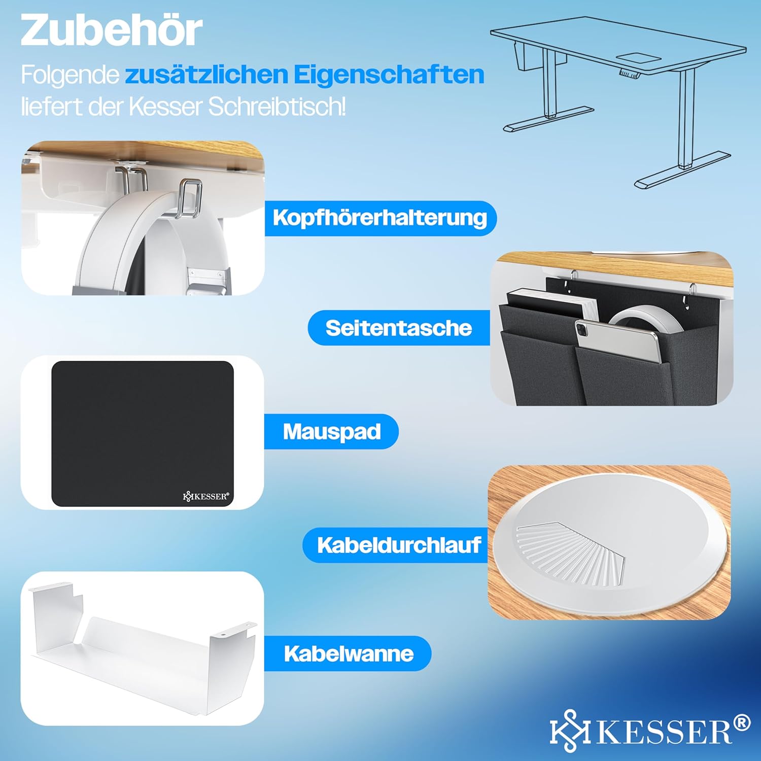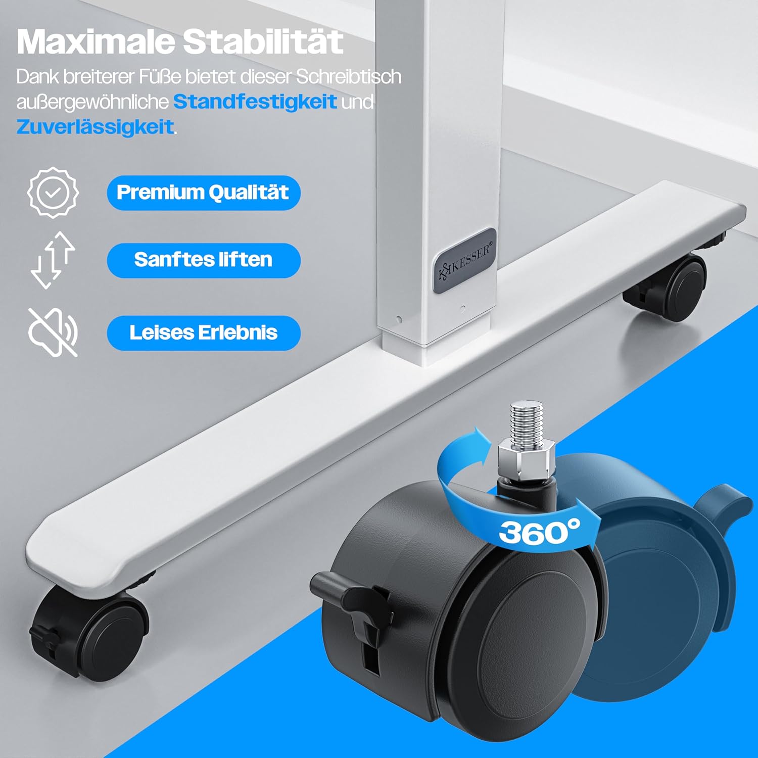 Premium kwaliteit en uitstekende kwaliteit: gemaakt van hoogwaardige materialen, biedt het KESSER bureau een lange levensduur en een stille ervaring bij het verstellen van de hoogte. De zachte lifting-technologie en de 360° wielen maken het bureau ideaal voor gebruik in grote kantoren, vergaderzalen en individuele kantoren. Verkrijgbaar in verschillende kleuren en maten, past hij perfect bij je kamer en je eisen.