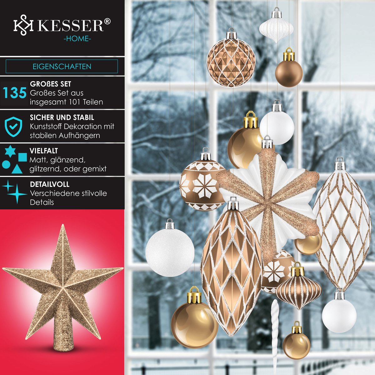 Een grote selectie van verschillende vormen en maten wacht op je in onze 105-delige kerstballen set van KESSER.Versier je kerstboom met matte, glanzende, glitterende en gemixte kerstballen, dus je bent verzekerd van afwisseling en plezier! We bieden een breed scala aan kleurencombinaties voor de komende kerst.Doordat de hangers op kleur zijn afgestemd, passen ze perfect bij je conifeer.