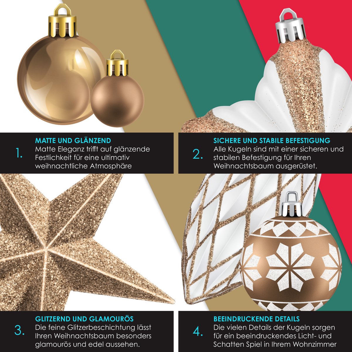 Matte elegantie ontmoet glanzende feestelijkheid voor de ultieme kerstsfeer.Alle kerstballen zijn voorzien van een veilige en stabiele bevestiging voor je kerstboom.Door de fijne glitterlaag ziet je kerstboom er bijzonder glamoureus en nobel uit.De vele verschillende details van de kerstboomornamenten creëren een indrukwekkend spel van licht en schaduw in je woonkamer.Vervaagt niet snel, dus ideaal voor binnen en buiten, dus je kunt je conifeer ook in de tuin of voortuin decoreren.