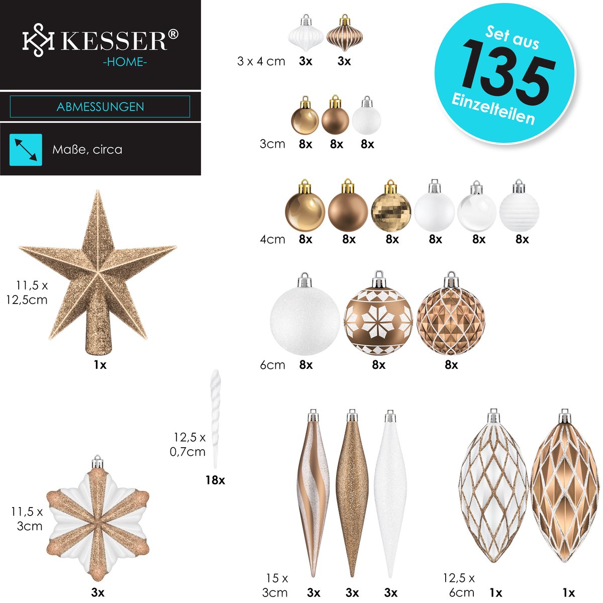 Kerstboomdecoratie deluxe set, 135 stuks, veilige en stabiele montage, diverse designs en verschillende maten, gedetailleerd, glitterlaag, mat, glanzend.