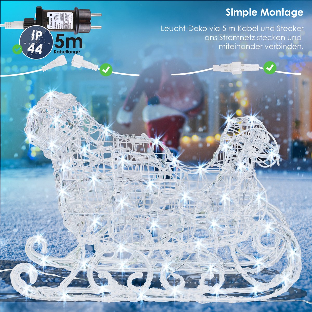 Uitgerust met IP-44 spatwaterbescherming is de LED slee met twee rendieren ook goed beschermd tegen regen en sneeuw .Dankzij de twee verschillende motieven kun je kiezen voor een wit of felgekleurd kleurenspel.De installatie is ongecompliceerd , sluit gewoon de lichtdecoratie aan via een 5m lange kabel en steek de stekker in het stopcontact en verbind ze met elkaar.