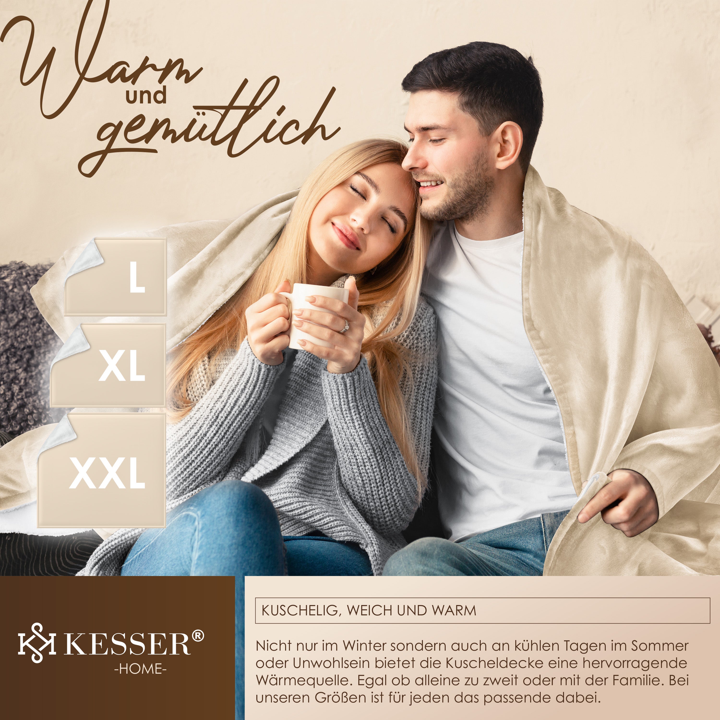 Deze veelzijdige maten: wij bieden de KESSER knuffeldeken in drie verschillende maten aan om ervoor te zorgen dat je altijd de juiste deken bij de hand hebt. Of je nu alleen wilt ontspannen of van gemeenschappelijke momenten met het gezin geniet, onze deken biedt voldoende ruimte en warmte om aan elke behoefte te voldoen.
