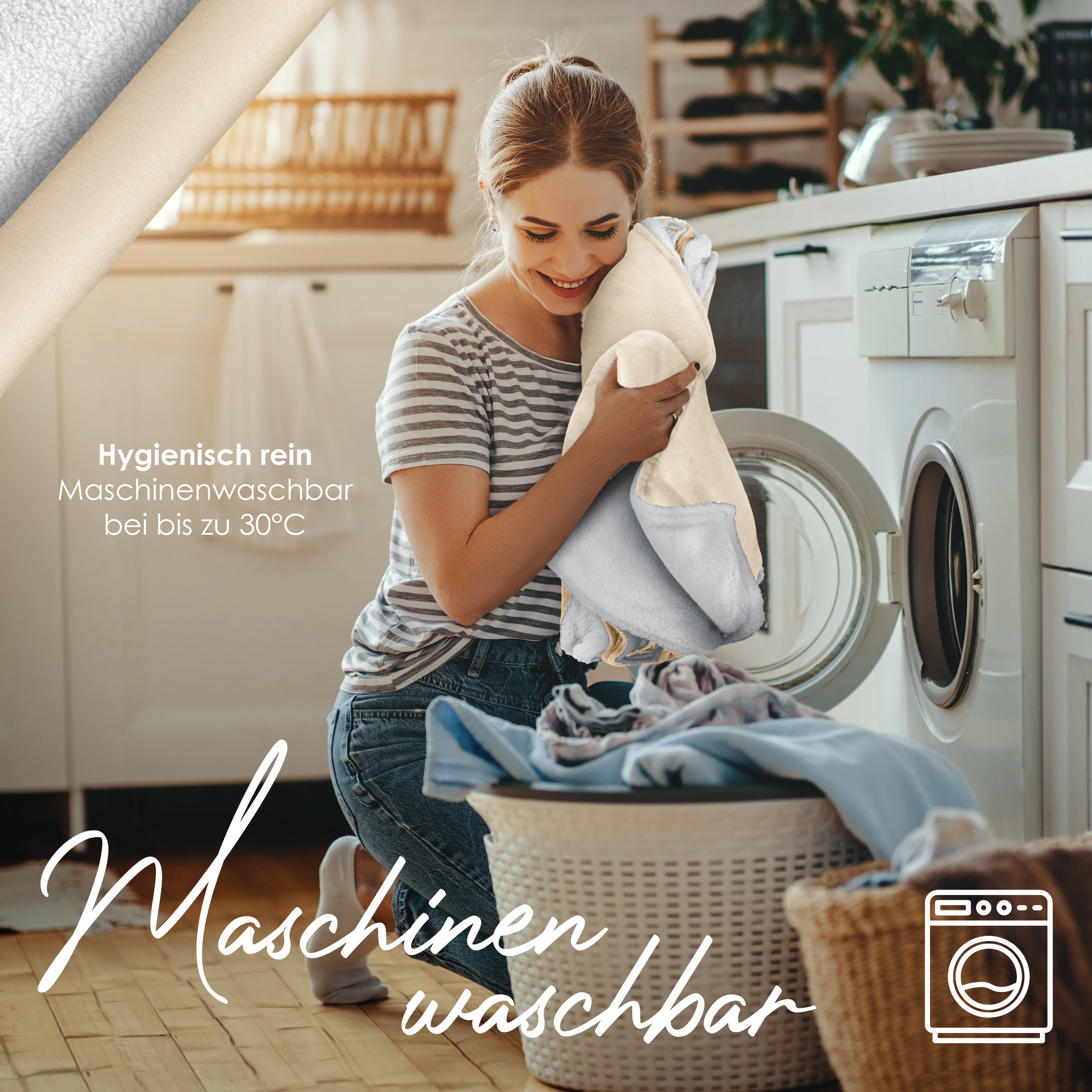 Zacht materiaal: onze KESSER knuffeldeken biedt een uniek gevoel van luxe en gezelligheid. De hoogwaardige materiaalmix van Sherpa en fleece geeft je een ongelooflijk zachte en behaaglijke ervaring, die je in de koude maanden warm houdt en tegelijkertijd een aangenaam huidgevoel biedt.