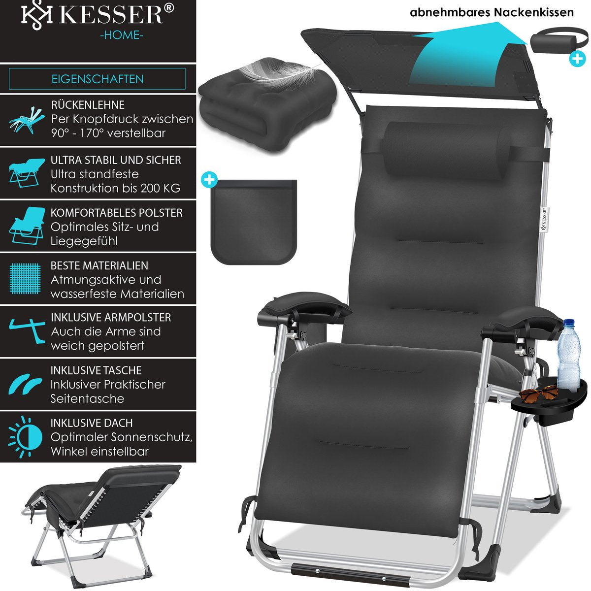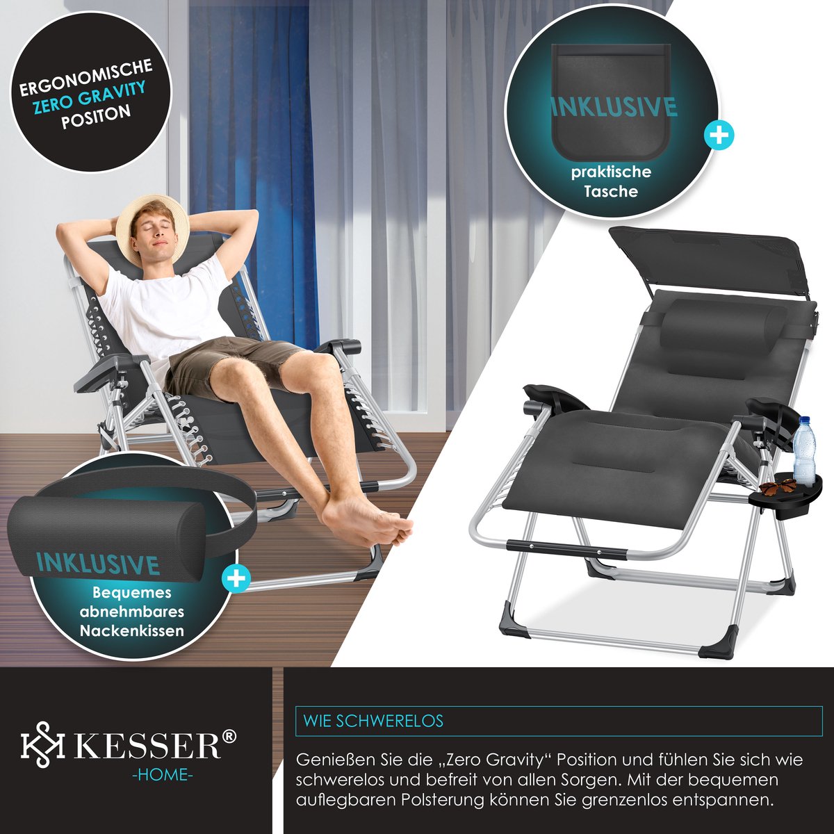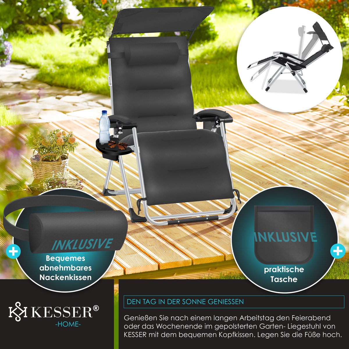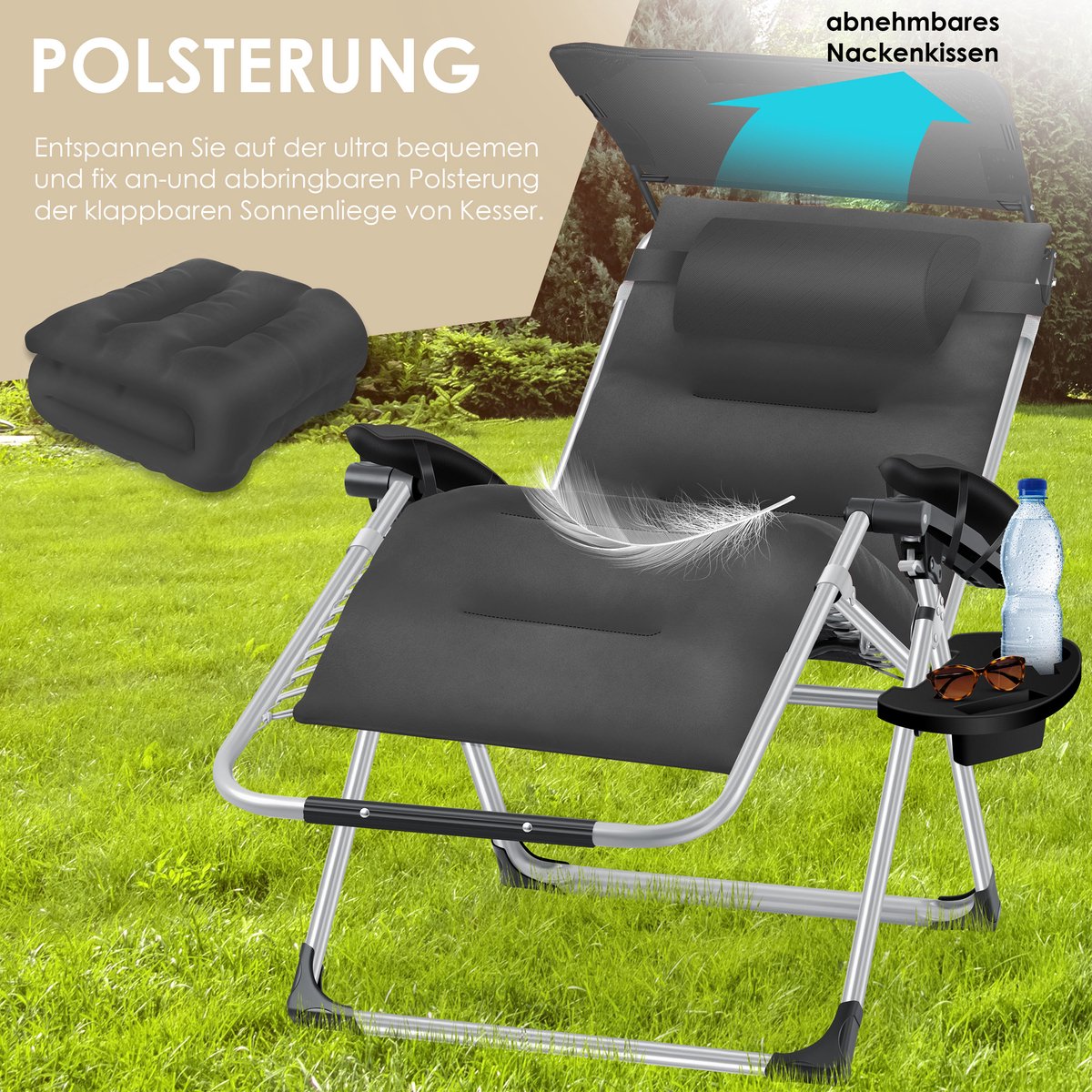 KESSER ligstoel met extra dikke, hoogwaardige bekleding, extra breed en comfortabel ligoppervlak met ergonomische en gewatteerde armleuningen, ademend en antislip materiaal, inclusief comfortabele hoofdsteunen, geïntegreerde opbergtafel, praktische zijvakken. Ultrastabiele ligstoelconstructie en antislip dankzij hoogwaardige hoeksteunen op de voetframes.