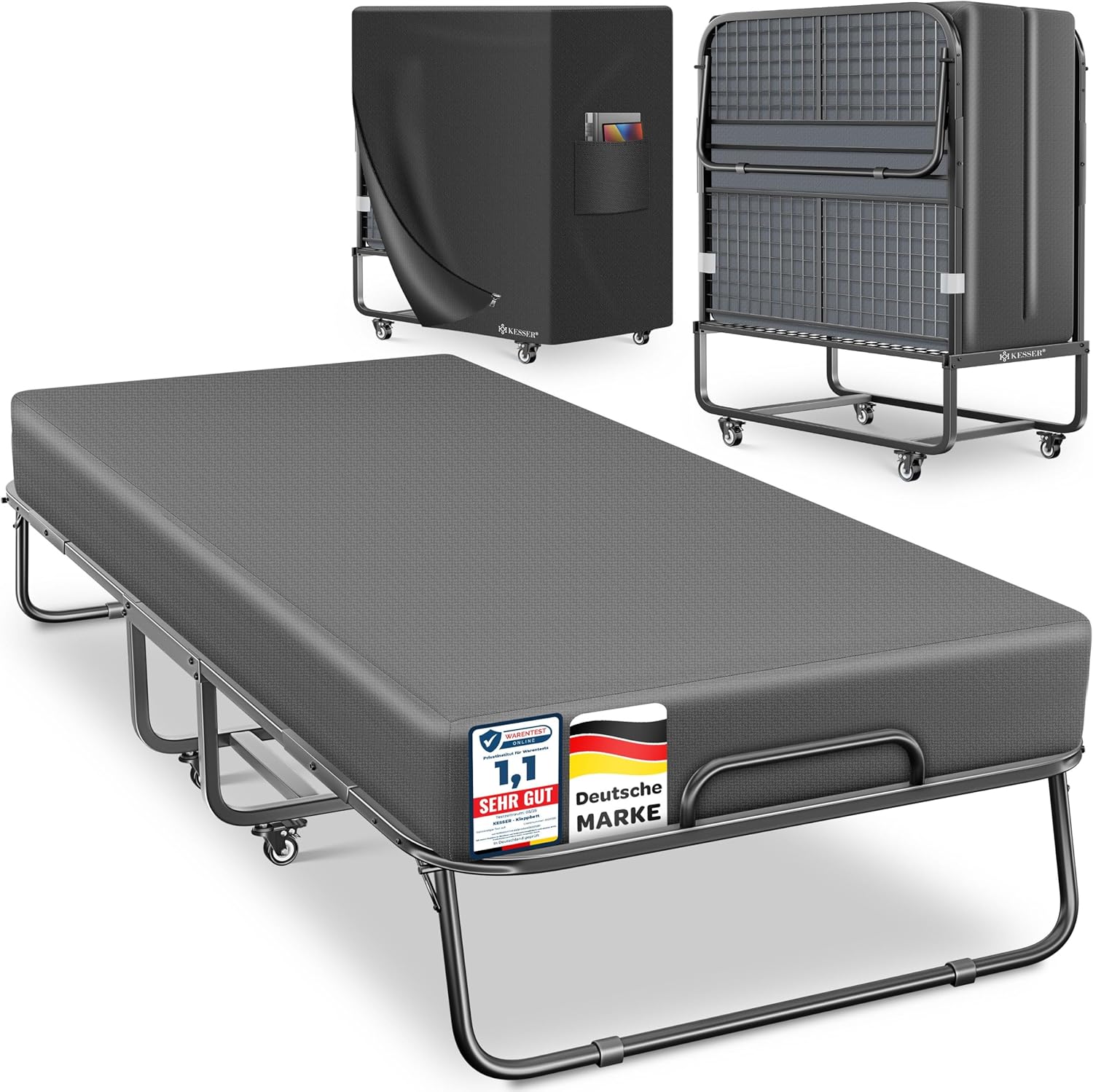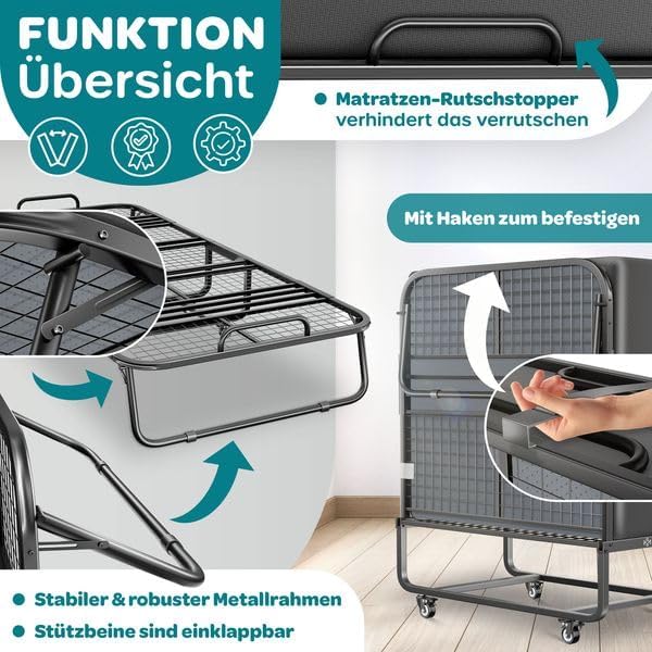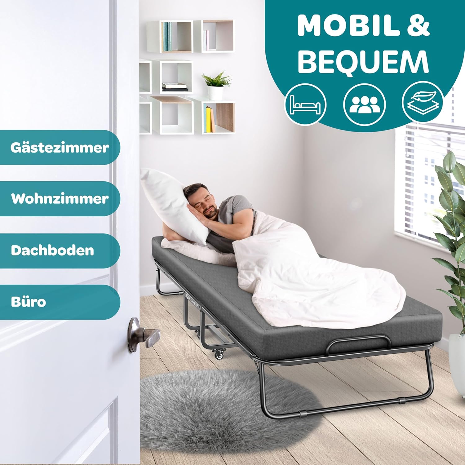 Snelle montage: dankzij de vier zwenkwielen met vergrendelingsfunctie kan het bed snel en eenvoudig worden vervoerd en veilig worden opgeborgen. Dit is bijzonder praktisch als je het bed vaak moet verplaatsen of opbergen. Ideaal voor logeerkamer, woonkamer, zolder of kantoor.