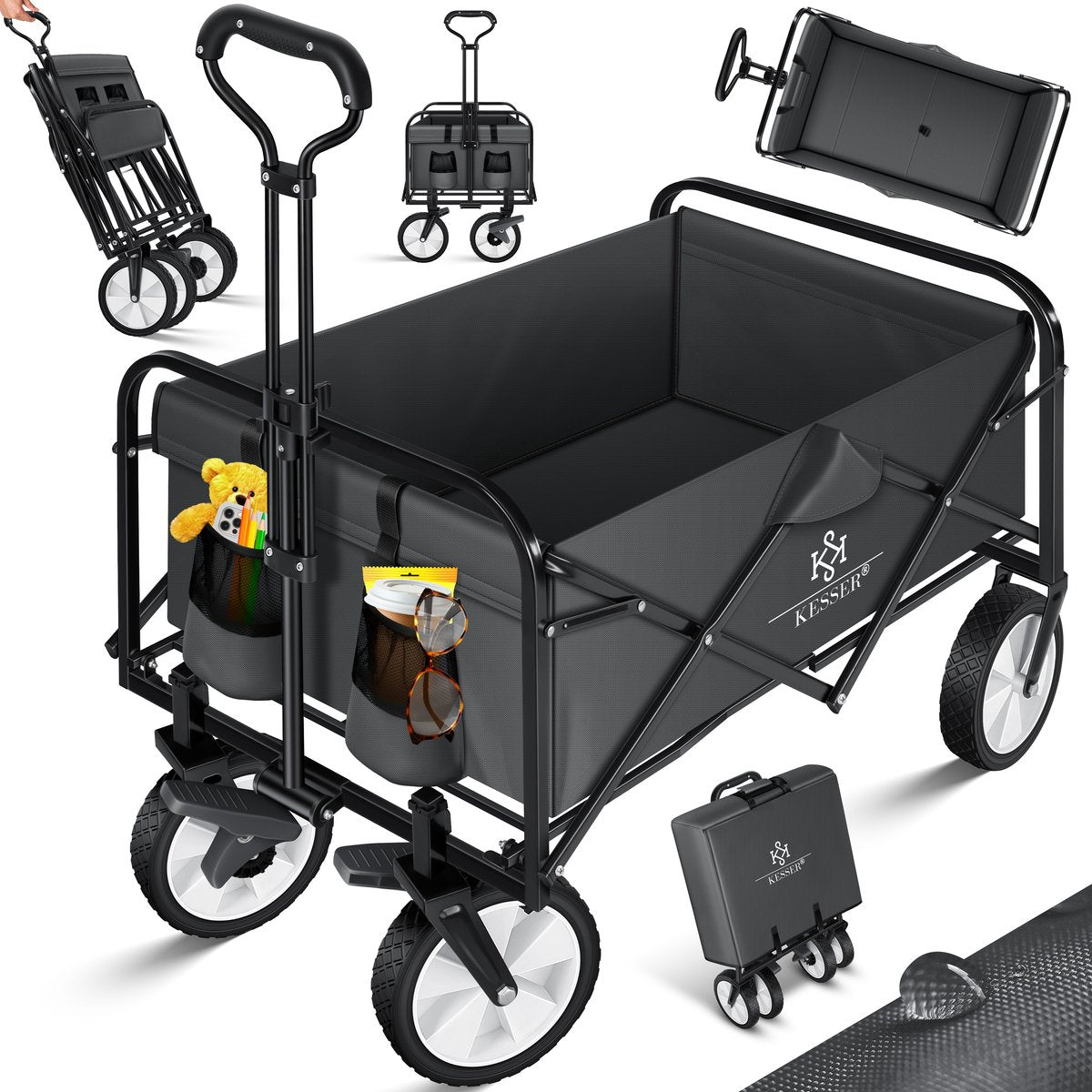 De opvouwbare bolderkar van KESSER is je ideale metgezel voor alle uitstapjes. Met zijn grote laadruimte en de extra bekerhouders biedt hij veel ruimte voor uitstapjes met de kinderen, festivals of andere vrijetijdsactiviteiten, en kan hij snel in elkaar worden gezet en weer worden opgeborgen om ruimte te besparen.
