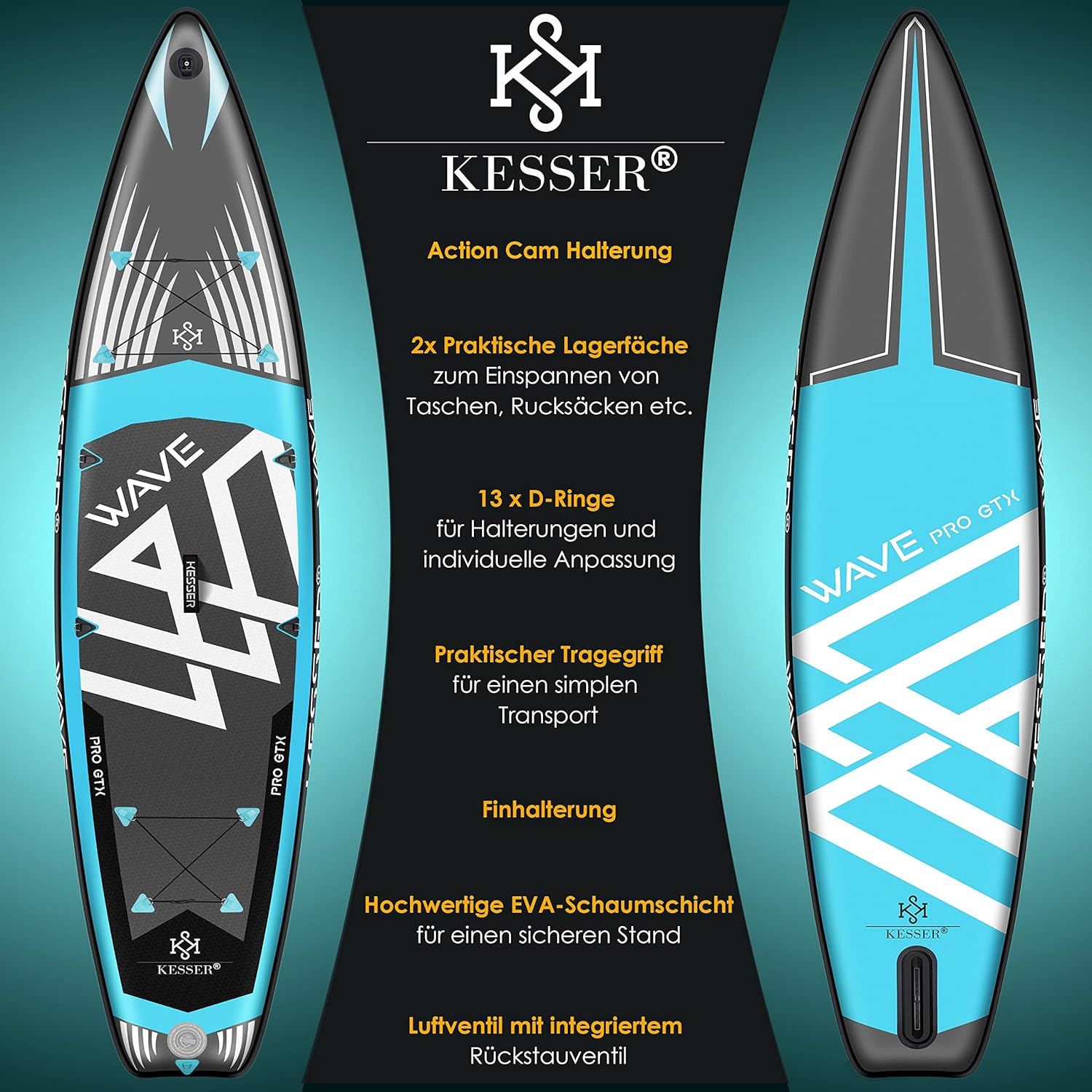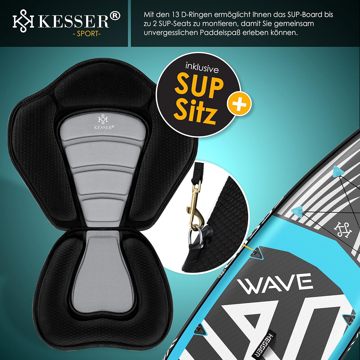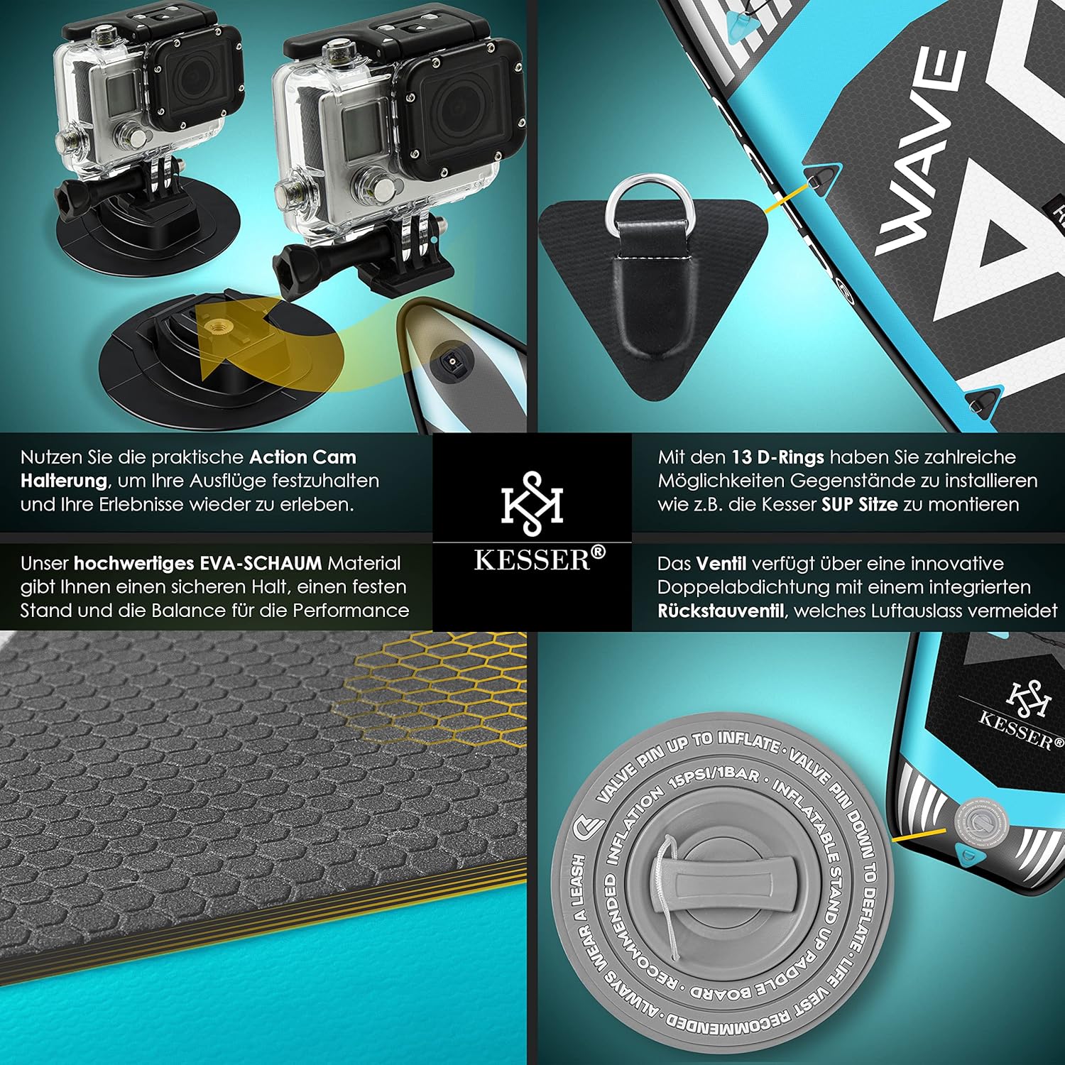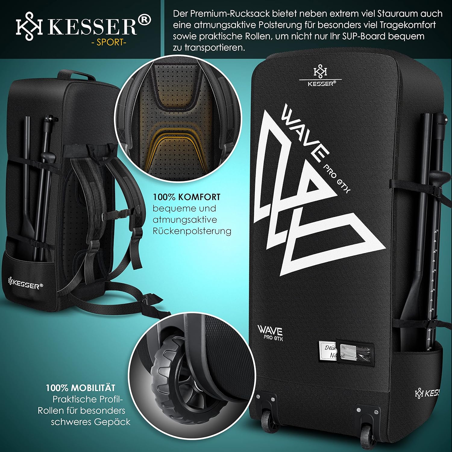 Het opblaasbare KESSER surfboard is als peddelboard of kajak te gebruiken en geschikt voor beginners tot gevorderde stand-up paddling-bestuurders. Hij kan moeiteloos op reis in de meegeleverde premium rugzak worden vervoerd. De tas is bovendien goed gevoerd, ademend en heeft bijzonder veel draagcomfort en praktische wielen voor bijzonder zware bagage – zo heb je het SUP-board altijd bij de hand en bovendien nog ruimte voor andere dingen. Ook kun je in de rugzak de meegeleverde reparatieset optimaal opbergen en heb je hem dus altijd binnen handbereik. Na gebruik kan het Kesser SUP-board heel eenvoudig worden opgevouwen en in de draagtas worden opgeborgen. Zo zijn het board, de hogedrukpomp en de peddel in een handomdraai veilig verpakt en klaar voor transport.