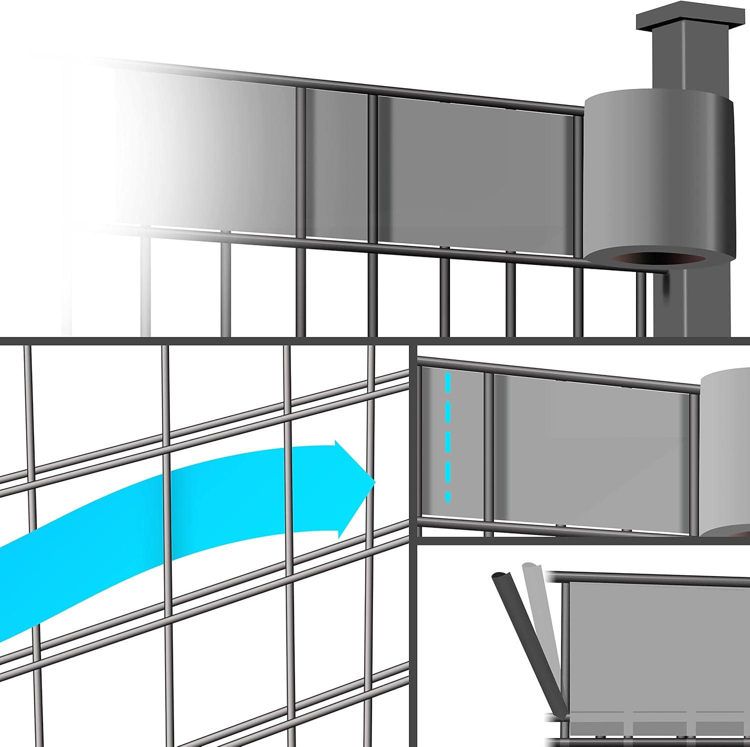 De hekfolie kan eenvoudig in een enkele of dubbele staafmattenhek worden gevlochten, geheel zonder gereedschap. Aan beide uiteinden wordt de zekering en bevestiging uitgevoerd via een van de 60 meegeleverde bevestigingsclips. Door de hoogte van 19 cm is de zichtwerende stroken geschikt voor alle gangbare staafmathekken.