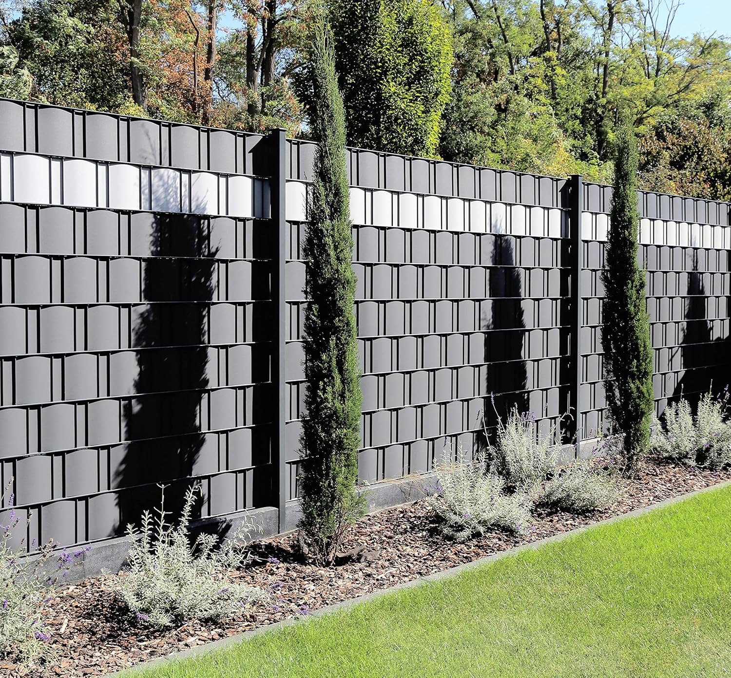 Veel verschillende ontwerpen nodigen uit om te combineren - zo kun je je tuin individueel en naar wens vormgeven. De geluiddempende functie zorgt ervoor dat lawaai en crack van de weg of de buren grotendeels worden verminderd. Bovendien beschermen de ondoorzichtige en moderne zichtwerende strips tegen nieuwsgierige blikken en creëren ze een ontspannen sfeer, of het nu op het terras, het balkon of in je tuin is.