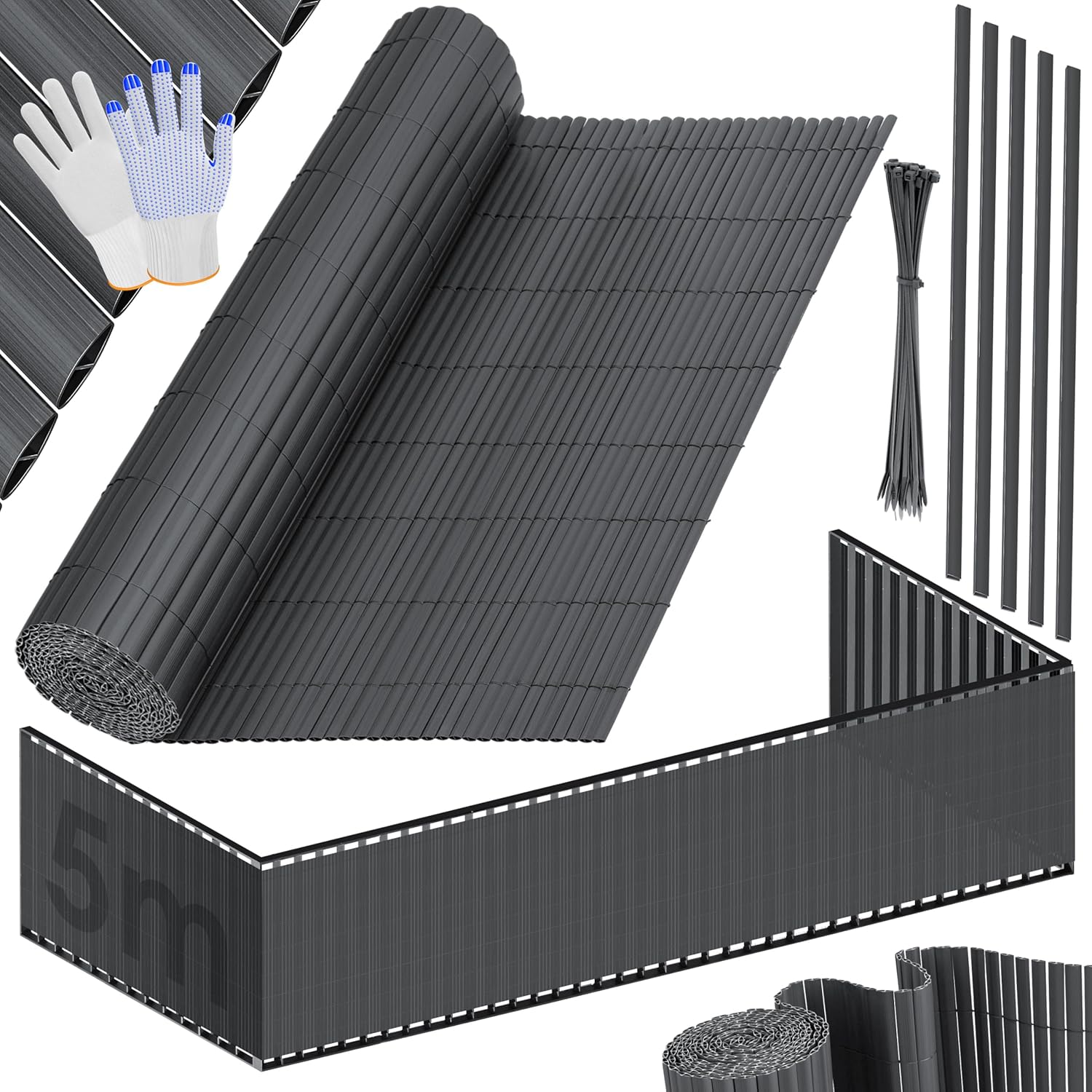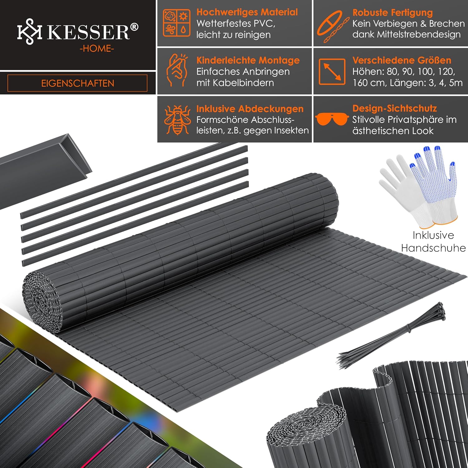 KESSER Hoogwaardige robuuste pvc-inkijkbescherming, waterdicht, onderhoudsvriendelijk en stijlvol voor een betere bescherming tegen shows. Met deze waterdichte en robuuste inkijkbescherming bescherm je jezelf en je kinderen tegen nieuwsgierige blikken en geef je huis meer stijl. Veelzijdige toepassingsmogelijkheden: van balkonzeil tot omheiningspaneel. Of het nu op een balkon, terras of tuin is, dit duurzame tapijt past perfect bij alles. Producteigenschappen: waterdicht, onderhoudsvriendelijk, privacybescherming, duurzaam, bestand tegen alle weersomstandigheden, schimmelvrij, ademend, ondoorzichtig, natuurlijk uiterlijk, decoratie/verfraaiing voor het balkon. Eenvoudige montage, breedte en lengte kunnen eenvoudig worden ingekort. Zonwering Technische gegevens: Materiaal: robuust pvc. Hoogte naar keuze: 80 cm, 90 cm, 100 cm, 120 cm, 160 cm. Lengte naar keuze: 3 m, 4 m, 5 m. Kleur: bamboe, bruin, antraciet naar keuze). Inhoud: PVC privacyscherm, 1 verpakking kabelbinders, 1 gebruikershandleiding